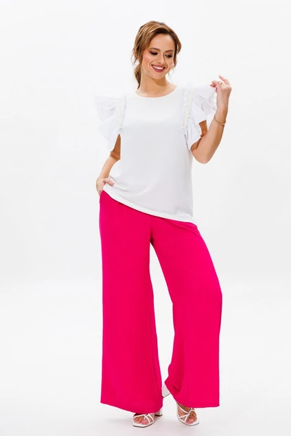 Летний женский костюм, состоящий из брюк и нарядной блузы, выполненный из костюмно-блузочной ткани (тянется). Блуза прямого силуэта с разрезами по бокам. Горловина округлой формы, обработанная окантовкой. Рукава в блузе в виде рюши из тафты, которые декорированы тесьмой с бусинами. Брюки прямого свободного кроя с высокой посадкой. В боковых швах наклонные карманы. Верхний срез оформлен поясом с эластичной резинкой.