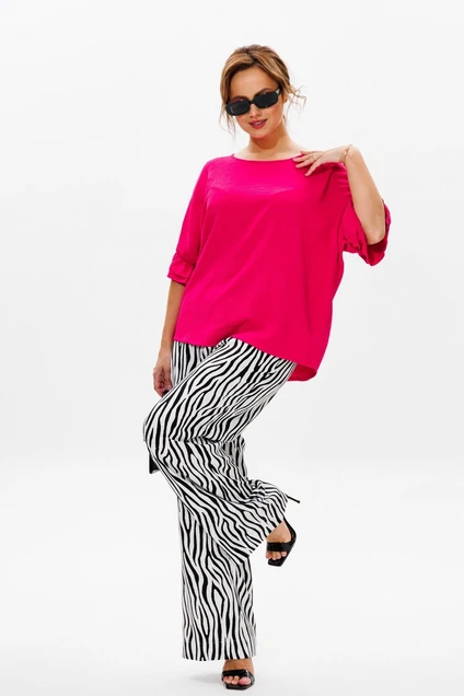 Блуза прямого свободного силуэта со спущенной линией плеча, выполненная из блузочной ткани (тянется). Горловина округлой формы, обработана окантовкой. Спинка со средним швом. Низ рукава оформлен двумя волонами, присборенными на резинку.