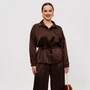 Жакет прямого кроя без подкладки, выполнен из двух видов костюмной ткани (тянется). По переду нагрудные вытачки, ассиметричный подрез. Застежка центральная, комбинированная: в верхней части - прорезная петля и отделочная пуговица, в нижней части – навесные петли и потайные пуговицы. Горловина оформлена воротником пиджачного типа с лацканом. Спинка со средним швом. Рукава втачные, двухшовные. Перед дополняет пришивной декор.
