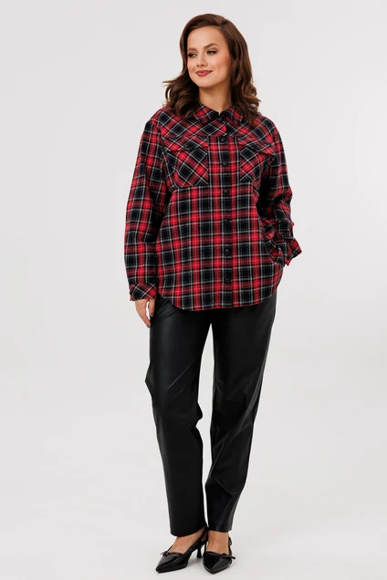 Рубашка прямого силуэта со спущенной линией плеча, выполненная из костюмной ткани в клетку (не тянется). По переду отрезные кокетки, в шов которых вставлен клапан, накладные карманы. Застежка центральная на петли-пуговицы. Спинка с отрезной кокеткой. Рукава втачные, двухшовные, по низу с притачной манжетой, застегивающейся на пуговицы. Воротник отложной рубашечного типа. Низ округлой формы.
