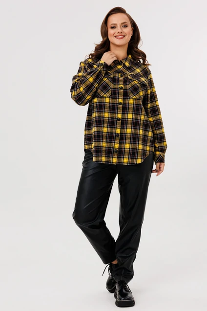 Рубашка прямого силуэта со спущенной линией плеча, выполненная из костюмной ткани в клетку (не тянется). По переду отрезные кокетки, в шов которых вставлен клапан, накладные карманы. Застежка центральная на петли-пуговицы. Спинка с отрезной кокеткой. Рукава втачные, двухшовные, по низу с притачной манжетой, застегивающейся на пуговицы. Воротник отложной рубашечного типа. Низ округлой формы.