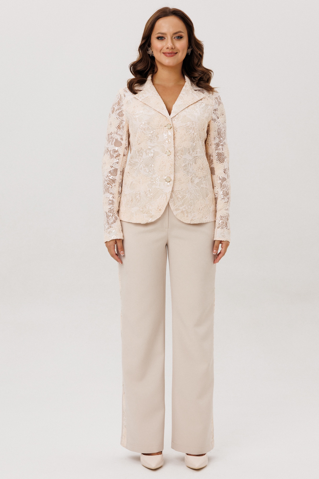 Нарядный женский костюм, состоящий из жакета и брюк, выполненный из костюмной ткани (тянется) и из гипюра с вышивкой и пайетками (не тянется).