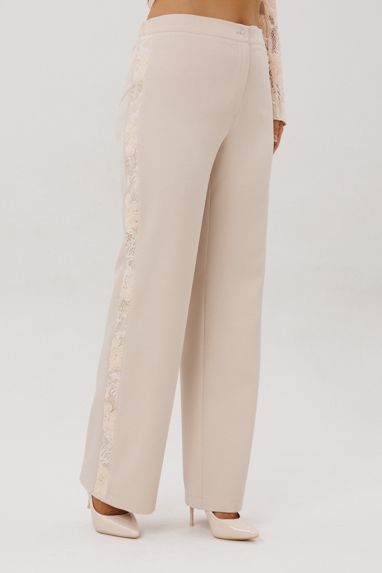 Брюки с высокой посадкой, немного с расширением от колена к низу. По срезу банта – застежка-молния. По боковым швам лампасы из гипюра. Верхний срез оформлен поясом с эластичной резинкой по задней половинке.