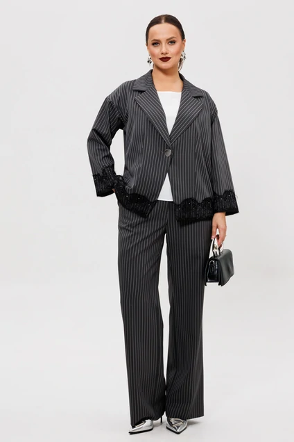Жакет прямого силуэта со спущенной линией плеча, выполнен из костюмной ткани в тонкую полоску (чуть тянется). По переду нагрудная вытачка, центральная застежка на одну петлю и пуговицу. Горловина оформлена воротником пиджачного типа с лацканом. Спинка со средним швом. Рукава одношовные, длиной 7/8. Жакет без подкладки. Жакет декорирован по низу и по низу рукавов французским кружевом со стразами.