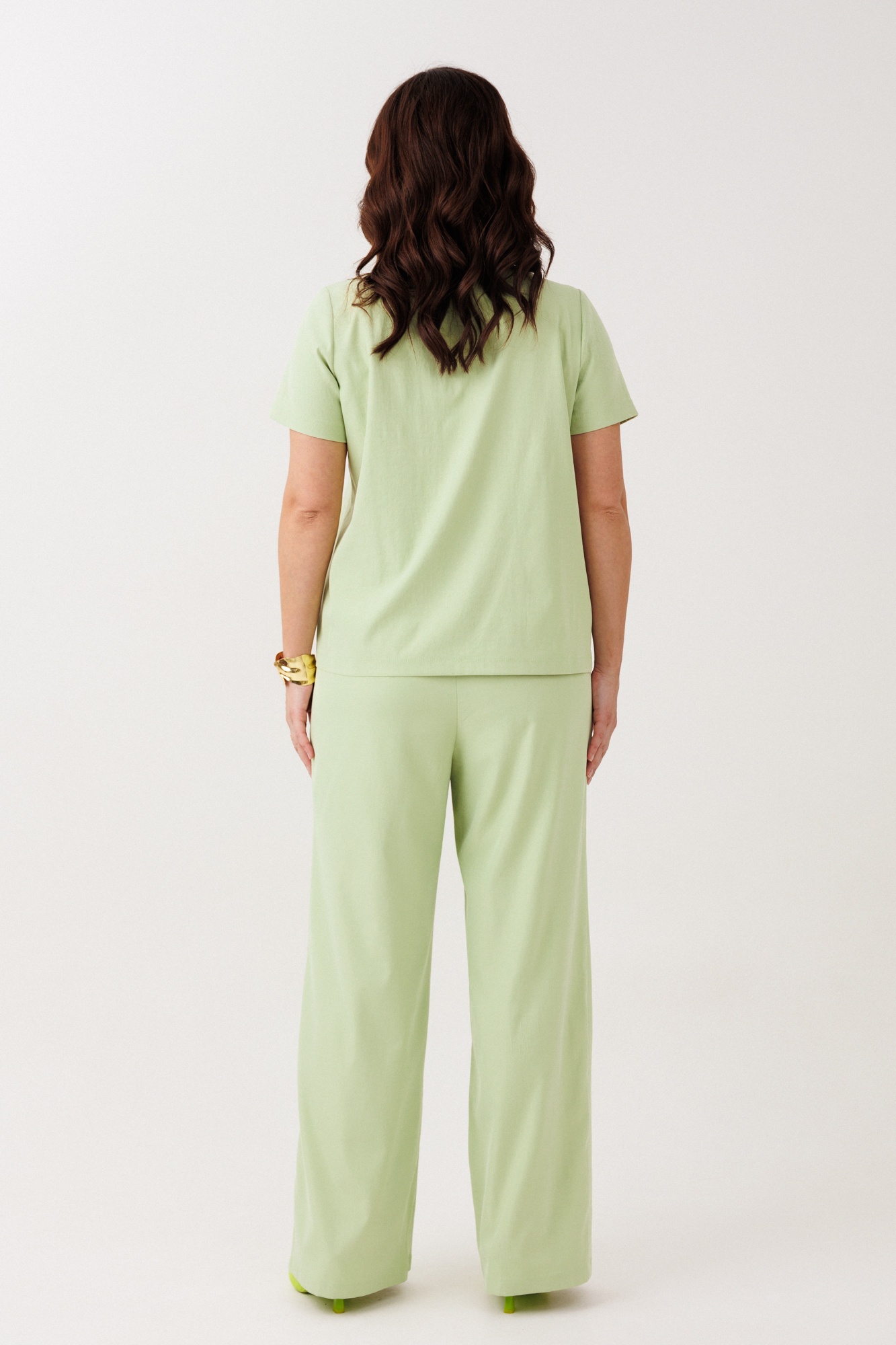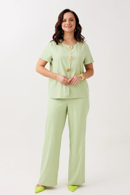 Костюм брючный 323 фисташка Мублиз — это стильное и удобное решение для современного гардероба. Коллекция бренда Мублиз представляет нарядный костюм, который состоит из блузы и брюк, изготовленных из костюмно-плательной ткани с добавлением вискозы, что обеспечивает мягкость и комфорт. Блуза свободного силуэта с изящной отделочной складкой и тремя съемными брошьами добавляет уникальности. Втачные рукава и округлая горловина создают классический образ. Свободный крой брюк и высокая посадка с поясом на эластичной резинке делают костюм практичным для повседневной носки. Фисташковый цвет идеально подходит для весенне-летнего сезона и подчеркивает свежесть образа.