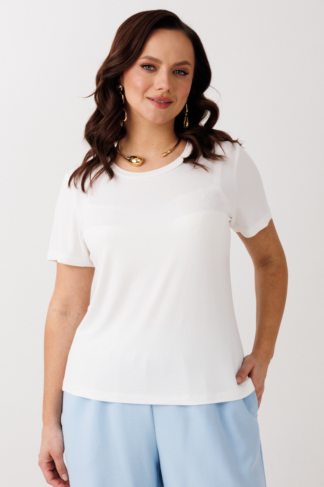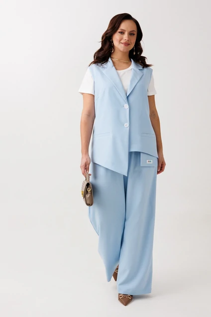 Костюм брючный 336 голубой Мублиз предлагает стильное и удобное решение для офисных и повседневных выходов. Коллекция бренда Мублиз акцентирует внимание на утончённости и комфорте. Жилет свободного кроя с асимметрией и функциональными карманами дополнен брюками с высокой посадкой и эластичной резинкой на поясе, что обеспечивает свободу движений. Блуза из эластичной вискозы добавляет комфорта и стиля. Основная ткань немного тянется, благодаря сочетанию хлопка, вискозы и полиэстера. Голубой цвет костюма идеально подходит для весенне-летнего сезона. Костюм не только выглядит стильно, но и практичен в использовании, обеспечивая комфорт на весь день.