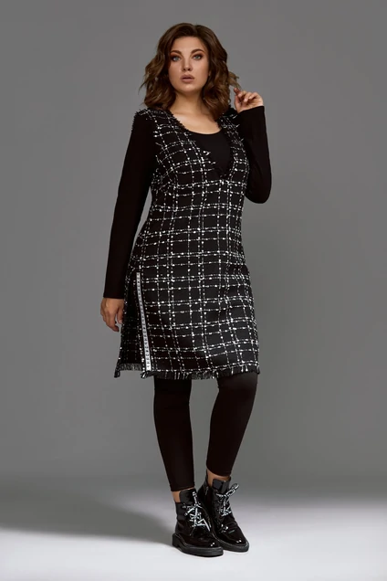 Костюм женский трех предметный, состоящий из жилета, блузы и лосин. Жилет удлиненный, полуприлегающего силуэта из костюмной ткани (не тянется). По боковым швам обработаны длинные разрезы. Декором служит тесьма по низу жилета. Блуза прилегающего силуэта из трикотажного полотна (вискоза, тянется). Лосины на притачном поясе из трикотажной ткани (тянется). Пояс полностью на резинке. Длина жилета – 91 см. Длина блузы – 59 см. Ширина рукава в пройме – 38 см. Длина рукава – 62 см. Длина лосин – 104 см.бл-виск95,спанд5;лосины-пэ95,эластан5