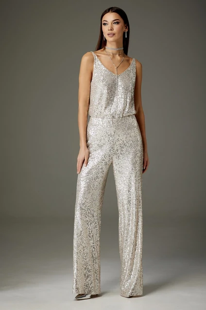 Брюки: расширены к низу, выполнены из трикотажного полотна с эффектом «пайеток», на подкладке до линии низа изделия. Пояс брюк на эластичной тесьме.