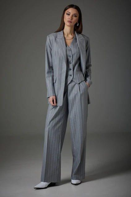 Комплект втачного покроя, свободного силуэта. Состоит из жакета жилета и брюк.