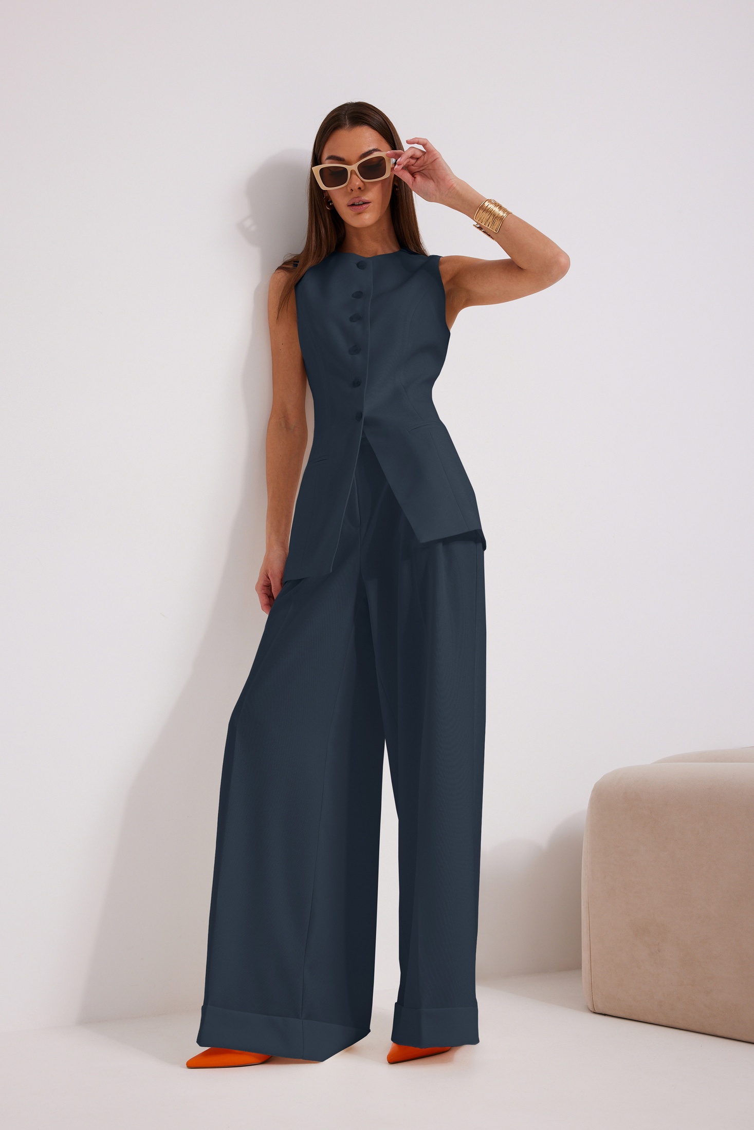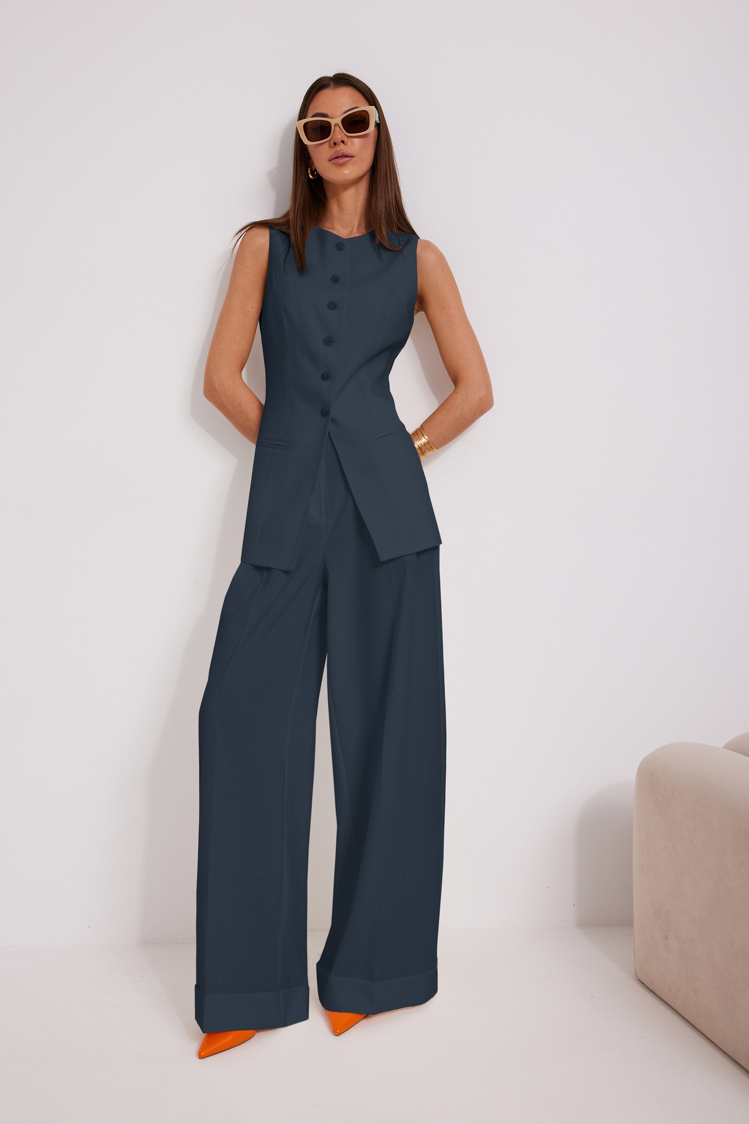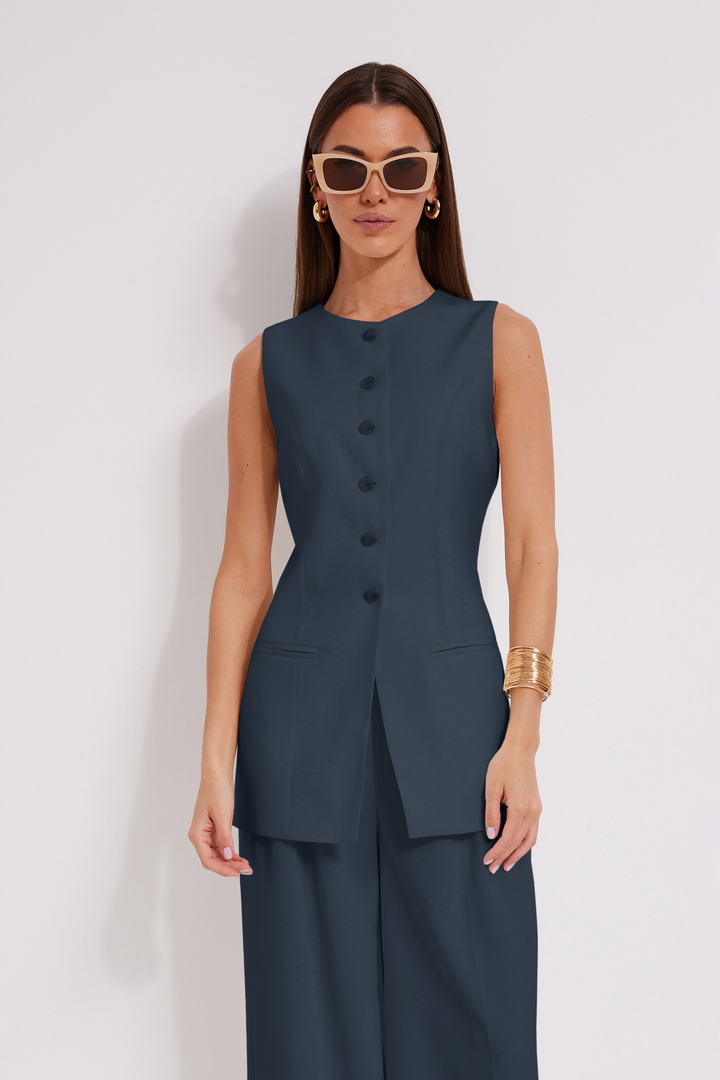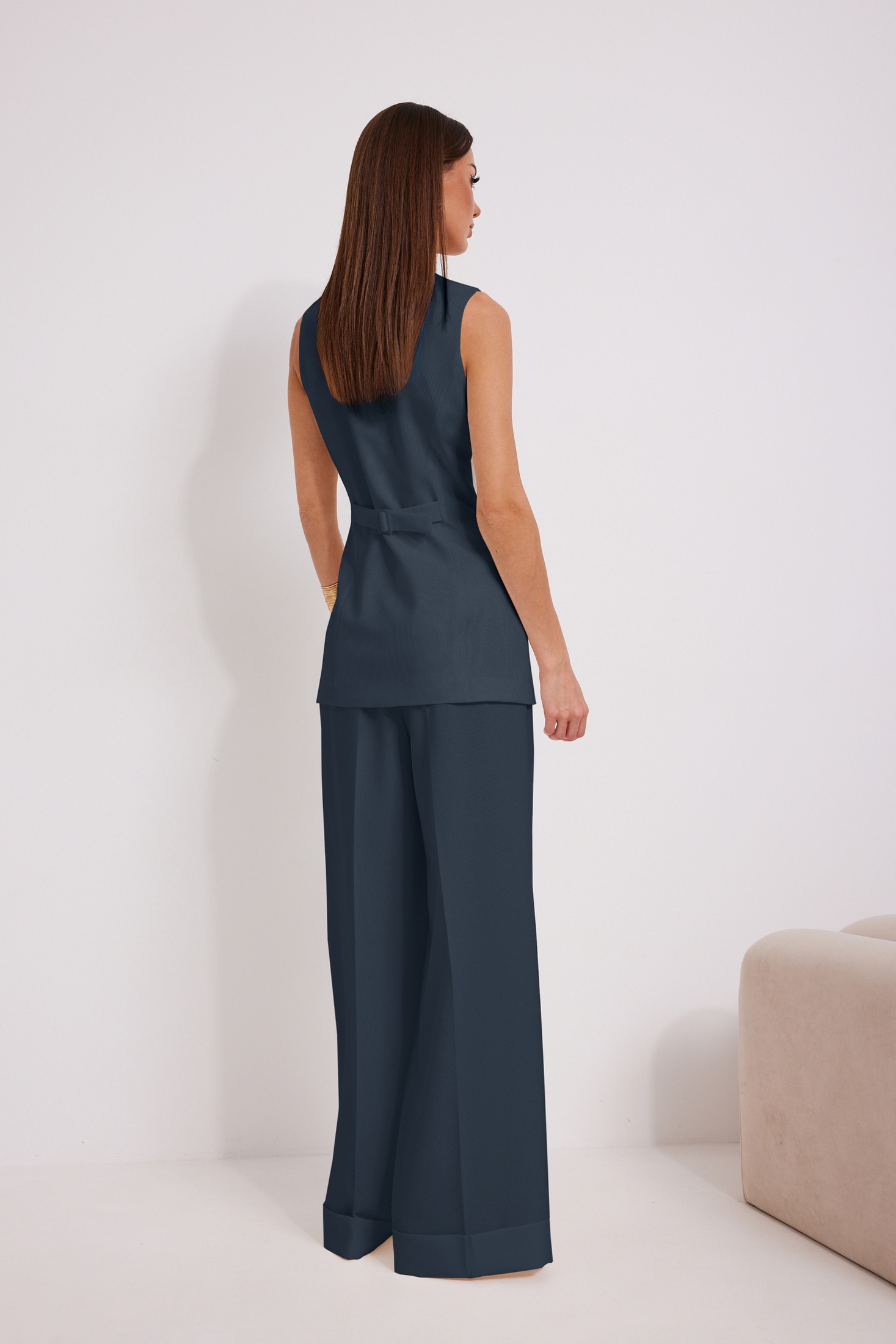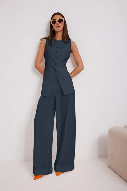 Костюм брючный 1575-1 синий N.O.W. — это идеальный выбор для тех, кто ценит стиль и комфорт. Коллекция бренда N.O.W. выполнена из качественной вискозы с добавлением полиэстера и спандекса, что делает костюм приятным на ощупь и долговечным. Жилет полуприлегающего силуэта с прорезными карманами и хлястиками с пряжкой, придающими элегантность и функциональность. Брюки свободной формы с манжетами и складками подчеркнут вашу индивидуальность. Костюм синего цвета идеально подходит для офисного и делового стиля, а также для праздничных мероприятий в межсезонье. Длина по боковому шву с поясом составляет 112 см, а длина жилета по спинке — 72–74 см. Наслаждайтесь удобством и уверенностью в каждом движении благодаря этому стильному комплекту.