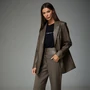 Костюм женский, состоящий из блузы и брюк, выполнен из ткани в полоску.
