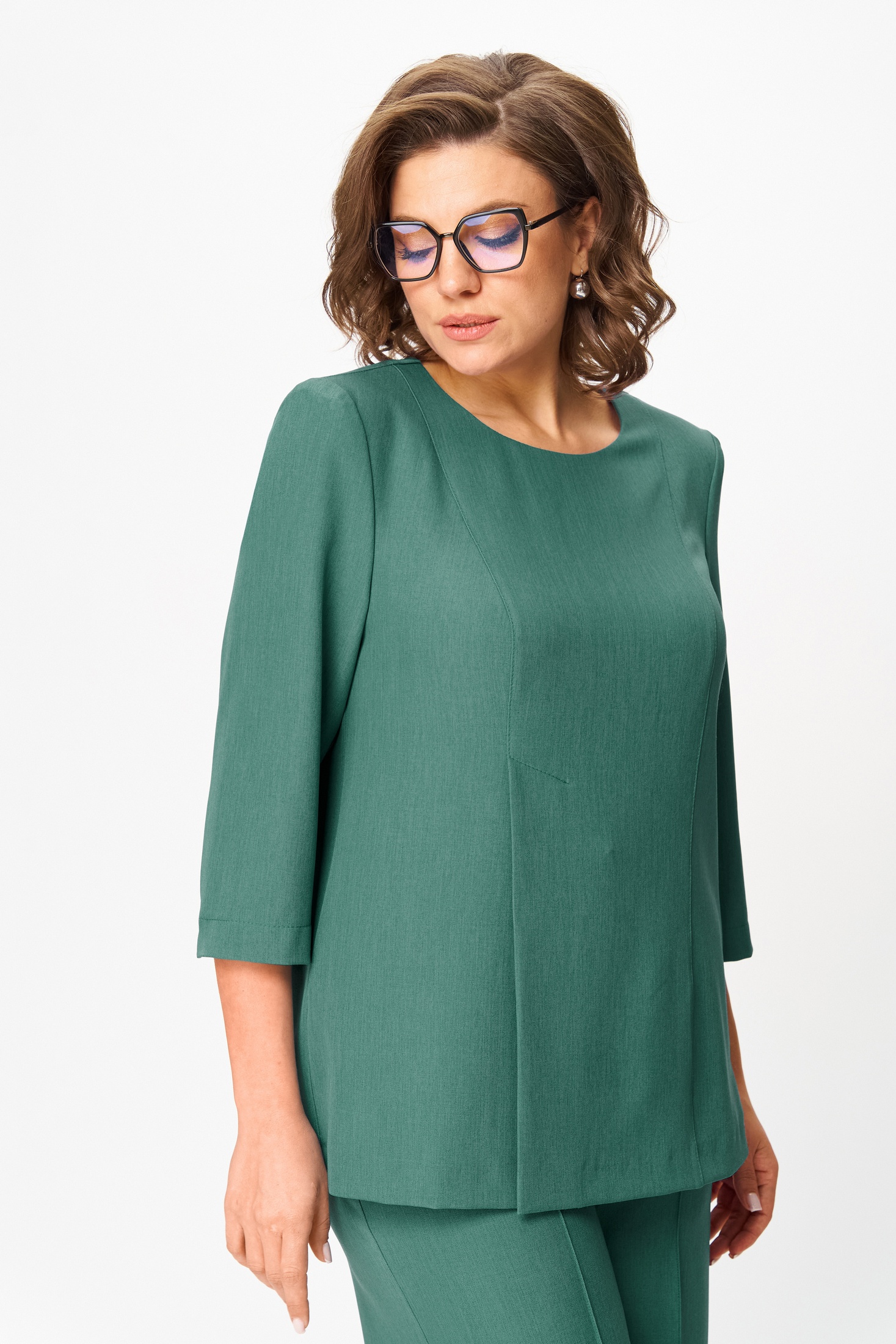 Костюм брючный 1611-1 N.O.W. из коллекции бренда представляет собой стильный комплект, сочетающий в себе элегантность и комфорт. Изготовлен из полиэстера с добавлением вискозы и эластана, костюм обеспечивает свободу движений и комфортное прилегание. Блуза прямого кроя с рельефными линиями и ярким акцентом в виде выреза «капелька» дополнена рукавом ¾ длиной, что подчеркивает её изысканный вид. Свободные брюки с поясом на петлю-пуговицу, наклонные карманы и застежка на молнию — идеальный выбор для деловых и повседневных встреч. Гармоничный зелёный оттенок подходит для всех сезонов, благодаря чему костюм станет незаменимым элементом гардероба.