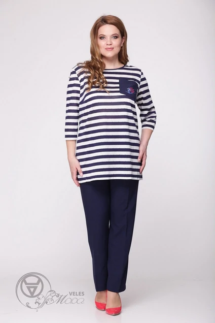 Комплект из лёгкой туники и брюк.Туника прямого силуэта. Перед выполнен из лёгкого трикотажа, на груди кармашек с вышивкой.Спинка комбинированная - верх- кокетка из лёгкого трикотажа, далее на тонком штапеле декоративная имитация застёжки под пуговицы.Длина туники-74 см .Рукав втачной , одношовный , длина -45 см. Брюки прямого силуэта из лёгкого текстиля ,карманов нет , пояс широкий ,в поясе вставлены резинки. Длина брюк -102 см.