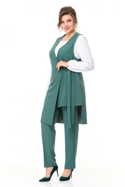 Комплект 3х предметный. Жилет разноуровневой длинны, таллия на завязке, по боковым швам разрезы. Блуза с округлой горловиной, длинным рукавом на резинке, по переду бантовая складка. Брюки прямые на притачном поясе , частично на резинке.