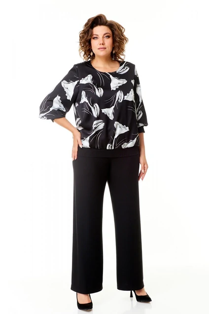 Костюм женский 2-х предметный. Блуза свободной формы на притачном поясе, по переду нагрудные вытачки. Рукав втачной одношевный с притачным манжетом. Брюки палаццо на поясе резинке из трикотажной ткани.