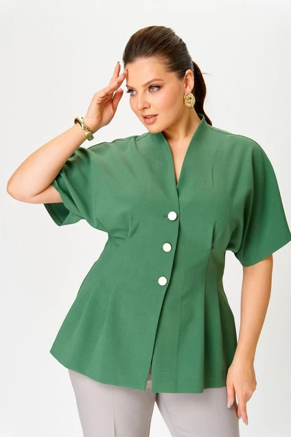 Элегантный женский костюм на две предметы представлен в утончённом гармоничном сочетании цветов. Блуза выполнена из качественного материала насыщенного зелёного оттенка, дополнена спущенными рукавами длиной 45 см от горловины, обеспечивающими свободу движений. Особенный акцент в дизайне верха — защипы по полочке и спинке, придающие образу женственности и изысканности. Брюки прямого кроя в нейтральном сером цвете дополняют ансамбль, создавая сбалансированный и стильный облик. Пояс на брюках притачной, с частичной резинкой, обеспечивает идеальную посадку и комфорт при носке. Длина брюк составляет 105 см, что позволяет идеально сочетать их как с обувью на каблуке, так и с более удобными вариантами. Такой костюм идеально подойдёт как для деловых встреч, так и для особых случаев, подчеркивая индивидуальность и вкус его владелицы.