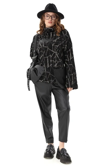 Костюм комбинированный двухпредметный: состоит из джемпера и брюки. Джемпер прямого свободного силуэта длиной до линии бедер, воротник хомут, рукав одношовный, втачной длиной до запястья. Спинка цельнокроеная. Перед состоит из двух частей- верхней и нижней. По нижней части переда сверху по центру вставка из отделочной ткани. По нижней части переда боковые накладные карманы из отделочной ткани, уходяшие в боковой шов, длинее линии низа переда вровень с линией низа спинки. Брюки с притачным поясом и с карманами в боковых швах.