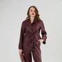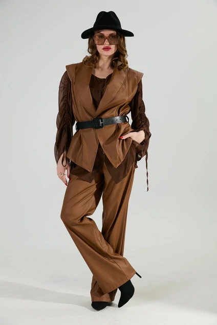 Костюм трехпредметный: состоит из блузы, брюк и жилета. Блуза прямого кроя с центральной застёжкой на петли и пуговицы. Вырез горловины глубокий округлый. Линия плеча приспущена. На рукавах изделия заложена декоративная сборка с регулируемыми завязками. В комплект к изделию идёт узкий пояс из основной ткани с авторским украшением ручной работы. Брюки свободного кроя, верхний срез представлен широкой резинкой, с карманами. Жилет удлиненный свободного прямого силуэта, воротник пиджачного типа. Линия низа по переду и спинке фигурная ассиметричная. Короткий рукав-крылышко. Талия фиксируется съемным ремнем из экокожи, для которого в боковых швах оформлены шлевки. Ремень идёт в комплекте к изделию.