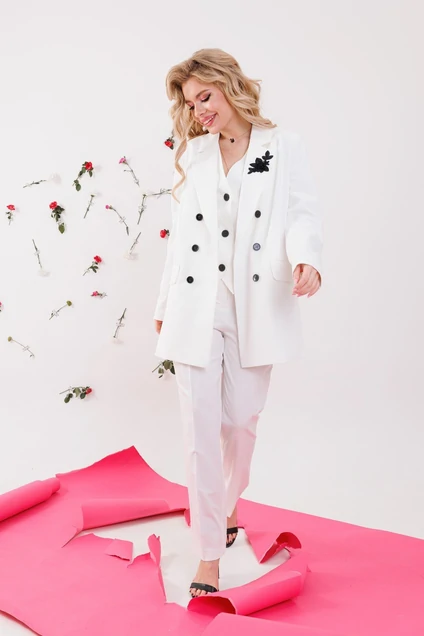 Обворожительный костюм-тройка: жакет, жилет и брюки. Жилет полуприлегающего силуэта, на подкладке. По переду рельефа карманы "листочки", застёжка на петли-пуговицы. По спинке вытачки и хлястик. Длина изделия 50 см. Жакет прямого силуэта. По переду нагрудная вытачка, переходящая в прорезной карман с клапаном. Двухбортная застёжка на петли-пуговицы. Рукав двухшовный, на логтевом шве отлетная шлица. Длина рукава 63 см. На лацкане брошь ручной работы "роза". Длина изделия 77 см. Брюки полуприлегающего силуэта,зауженные к низу. По переду боковой карман, застежка на тесьму-молнию и пуговицу. Длина брюк 99 см.