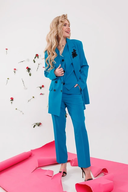 Обворожительный костюм-тройка: жакет, жилет и брюки. Жилет полуприлегающего силуэта, на подкладке. По переду рельефа карманы "листочки", застёжка на петли-пуговицы. По спинке вытачки и хлястик. Длина изделия 50 см. Жакет прямого силуэта. По переду нагрудная вытачка, переходящая в прорезной карман с клапаном. Двухбортная застёжка на петли-пуговицы. Рукав двухшовный, на логтевом шве отлетная шлица. Длина рукава 63 см. На лацкане брошь ручной работы "роза". Длина изделия 77 см. Брюки полуприлегающего силуэта,зауженные к низу. По переду боковой карман, застежка на тесьму-молнию и пуговицу. Длина брюк 99 см.