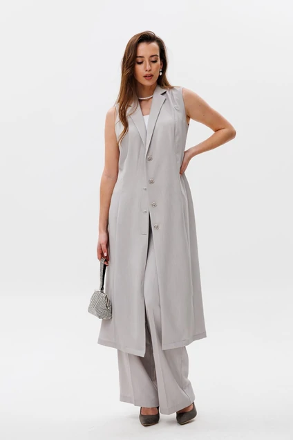 Костюм трехпредметный: состоит из топа, жилета-платья и брюк. Жилет удлиненный полуприлегающей силуэтной формы без рукавов. Полочка со смещённым бортовым краем назапах, с рельефными швами от линии плеча до низа. Застежка на петли и пуговицы. Спинка со средним швом и талиевыми вытачками. Воротник отложной с отрезной стойкой . Топ на регулируемых бретелях с полукруглым вырезом. Брюки свободного кроя, верхний срез представлен широкой резинкой, с карманами. топ - 100% пэ, атлас