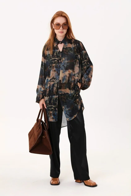 Костюм двухпредметный: состоит из блузы и брюки. Блуза свободного прямого кроя прямого силуэта с V-образным вырезом. Воротник стояче-отложной рубашечного типа, застёгивается на декоративную пуговицу и петлю. Рукава объёмные, собраны на резинку. В боковых швах и по переду разрезы. Брюки свободного кроя, верхний срез представлен широкой резинкой, с карманами.