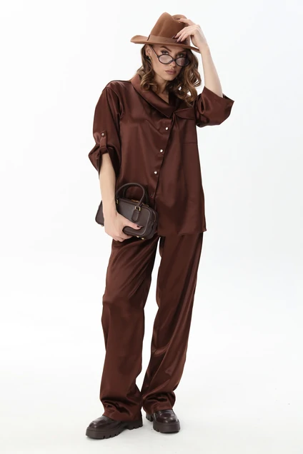Костюм двухпредметный: состоит из жакета и брюк. Жакет рубашечного типа прямого силуэта с асимметричным низом. Рукав втачной со спущенной линией плеча, фиксируется на пату. Застежка центральная на петли и пуговицы, смещённая по косой. На левой полочке накладной карман с клапаном. Воротник отложной на стойке до половины спинки. Брюки свободного кроя из гладкой ткани сочетают элегантность и комфорт. Широкая резинка на поясе и наличие функциональных карманов подчеркивают удобство модели.
