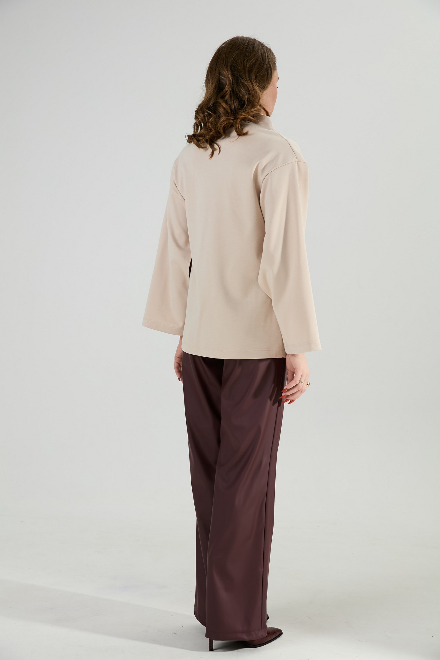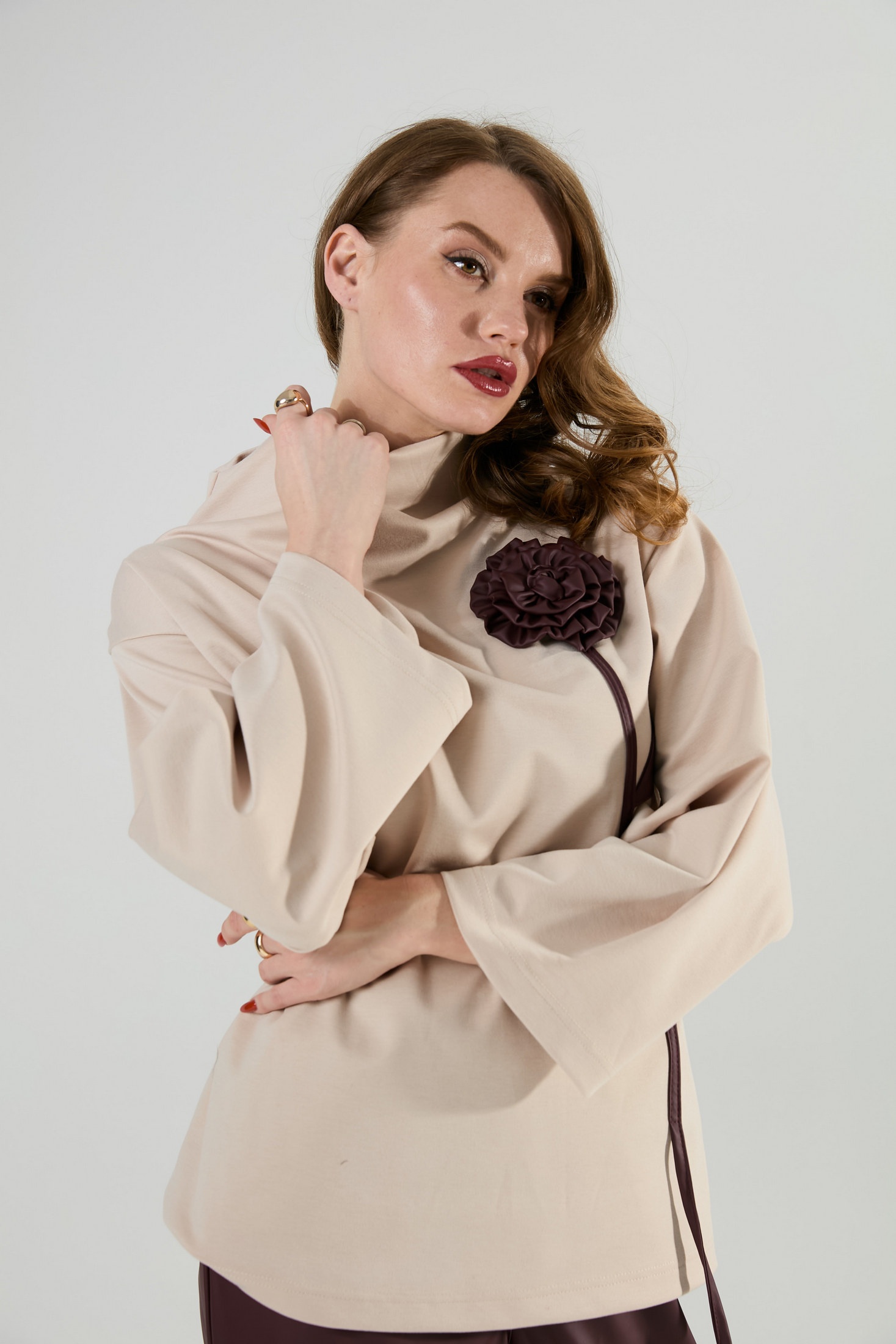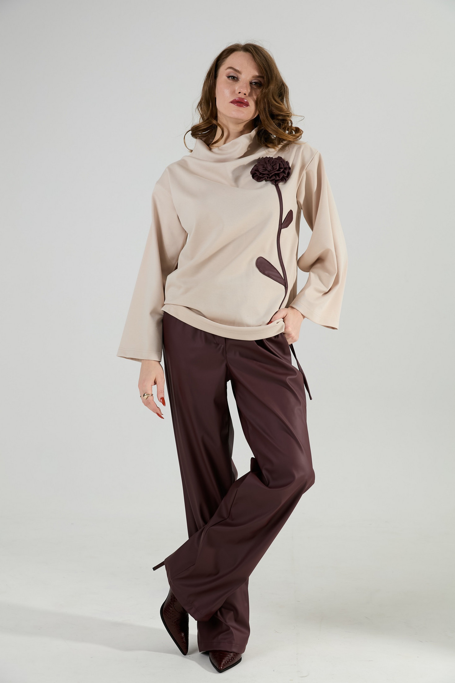 Костюм двухпредметный: состоит из джемпера и брюк. Джемпер-кейп прямого свободного силуэта. Горловина с цельнокроеным воротником-стойкой. Рукав втачной широкий, от линии локтя до запястья есть дополнительное отверстие для рук. Декорирован цветком из контрастной ткани. Брюки свободного кроя, верхний срез представлен широкой резинкой, с карманами.