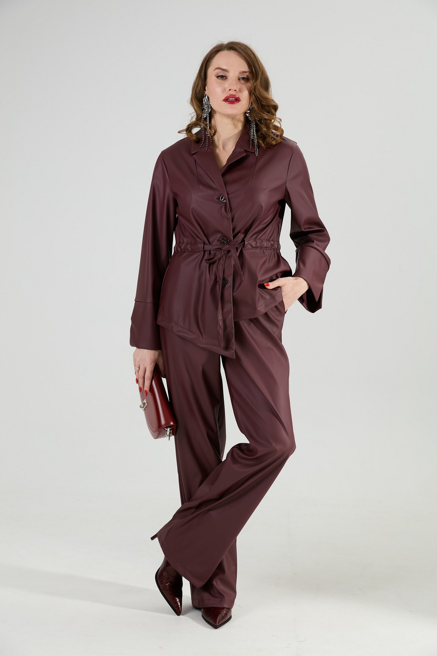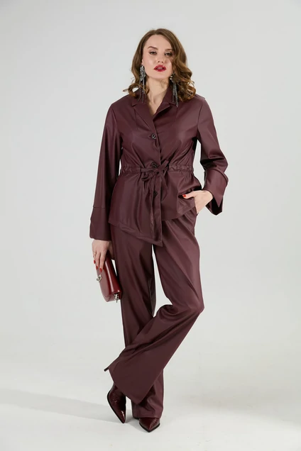 Костюм двухпредметный: состоит из жакета и брюк. Жакет прямого силуэта, воротник пиджачного типа, рукав одношовный, втачной с незначительно спущенной линией плеча, длинный, с притачной манжетой, декорированной разрезом. По линии ткани настрачная кулиса с завязками из основной ткани. Застежка центрально-бортовая. Линия низа верхней части фигурная ассиметричная. Брюки свободного кроя, верхний срез представлен широкой резинкой, с карманами.