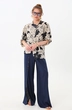 Костюм двухпредметный: состоит из жакета и брюк. Жакет рубашечного типа прямого силуэта с асимметричным низом. Рукав втачной со спущенной линией плеча, фиксируется на пату. Застежка центральная на петли и пуговицы, смещённая по косой. Воротник отложной на стойке до половины спинки. Брюки свободного кроя, верхний срез представлен широкой резинкой, с карманами. По центру правой брючины расположена планка с функционирующими петлями и пуговицами.