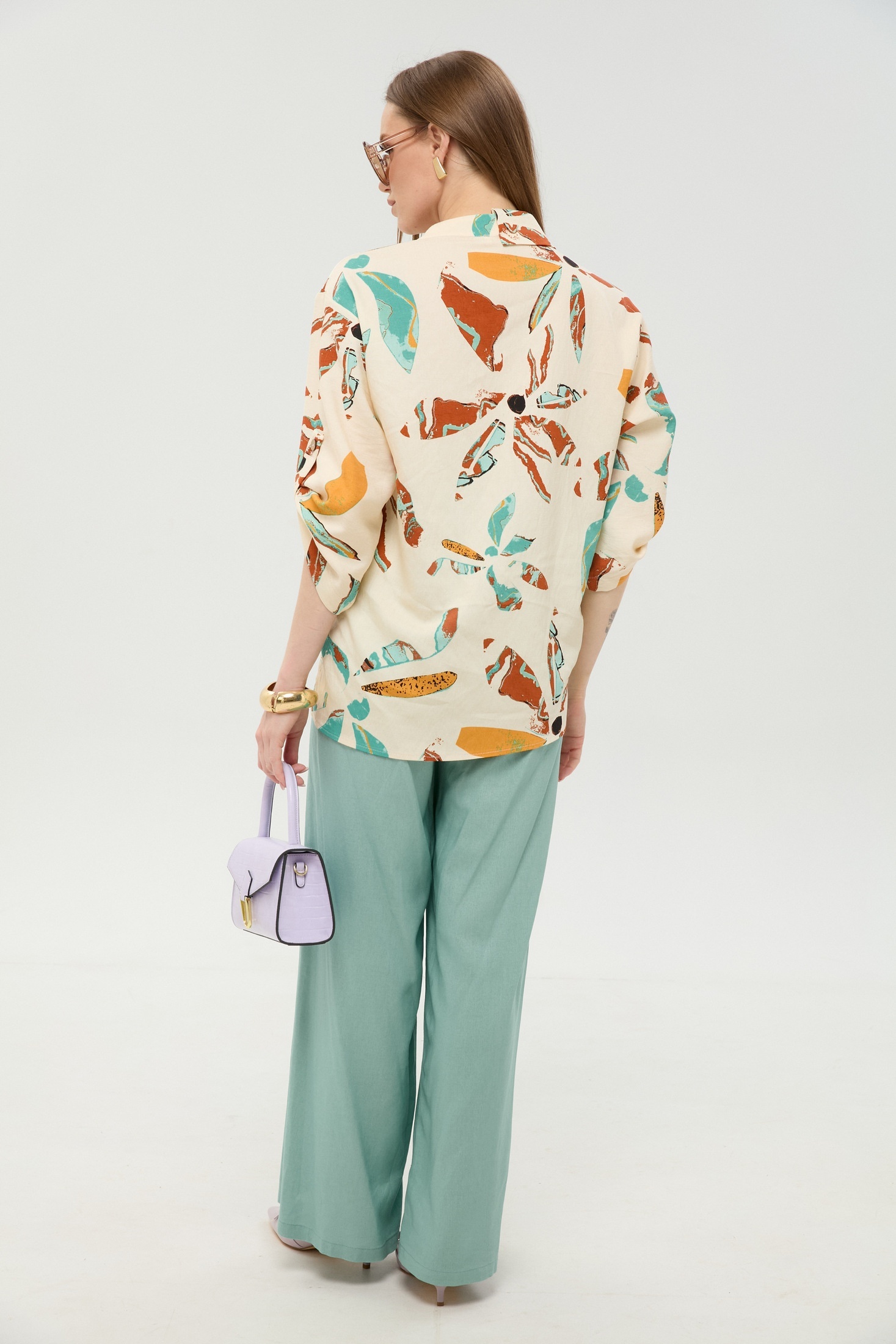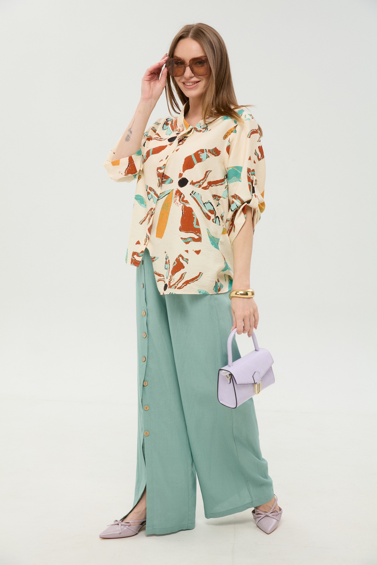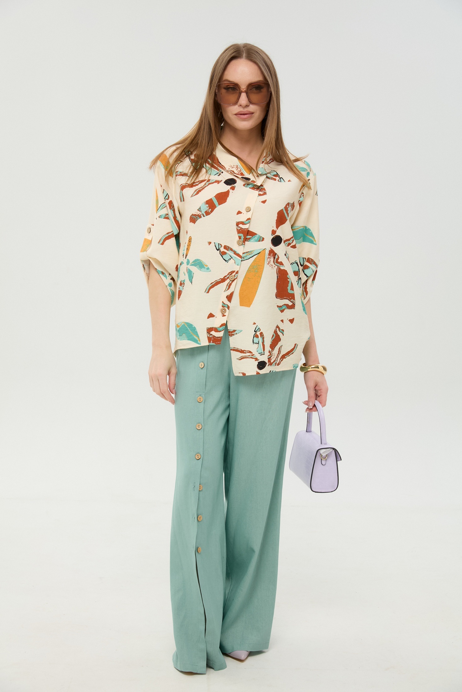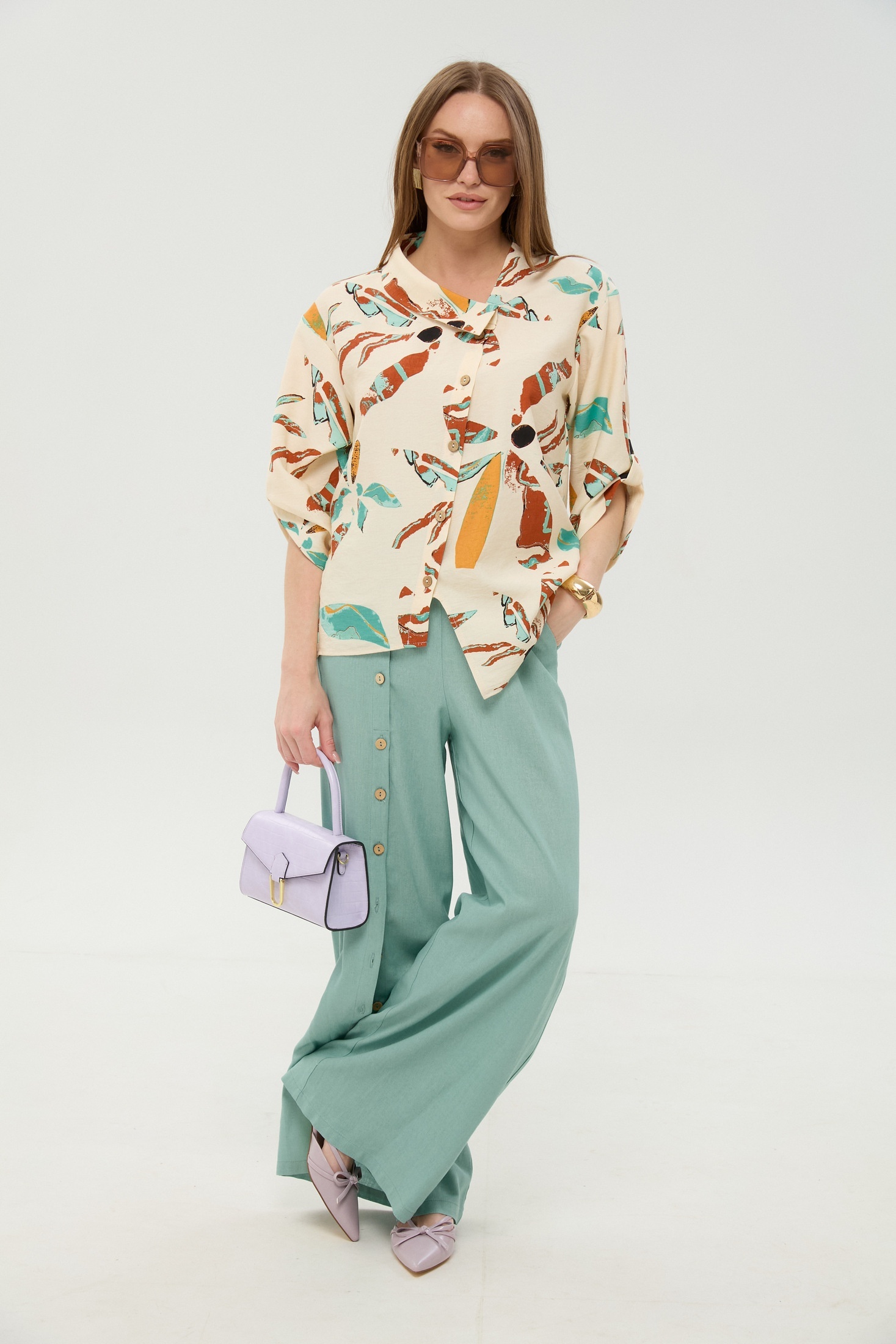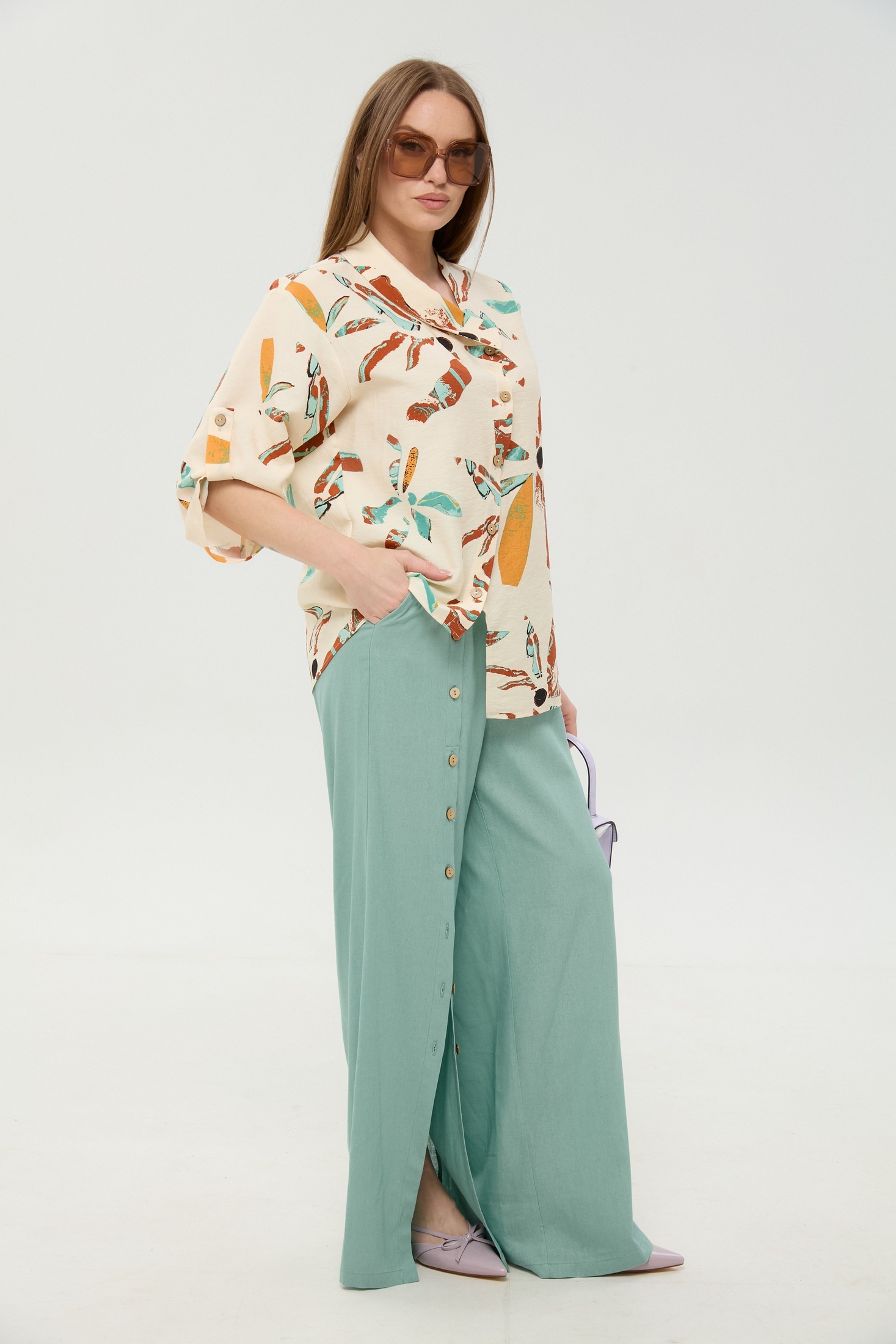 Костюм брючный 978-7 мята и бохо мультиколор NikVa — это стильное сочетание свободы и утончённости. Коллекция бренда NikVa выполнена из натуральных материалов: лён, вискоза и хлопок. Жакет рубашечного типа с асимметричным низом и спущенной линией плеча придаёт образу лёгкость. Свободные брюки с широкой резинкой и карманами обеспечивают комфорт в течение дня. Уникальность добавляет планка с пуговицами на брюках и воротник на стойке. Идеален для весенне-летнего сезона, подходящий как для прогулок, так и для офиса. Мятный и мультиколор бохо принт подчеркивают свежесть и оригинальность образа.
