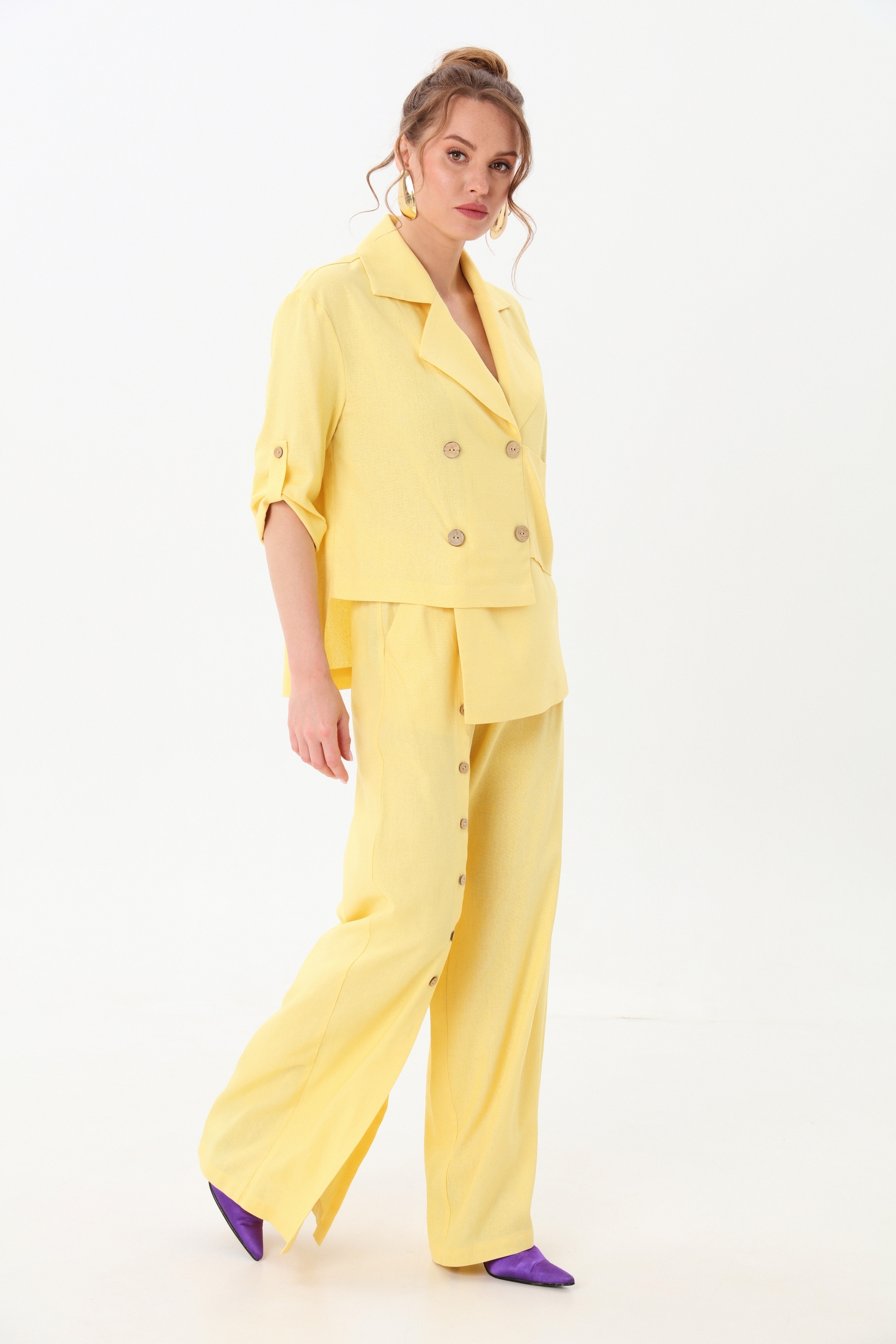 Костюм двухпредметный: состоит из жакета и брюк. Жакет прямого силуэта с имитацией центральной застёжки на пуговицы. Рукав втачной одношовный, длиной три четверти,застегивающийся на пату. Воротник пиджачного типа. Линия низа фигурная, симметричная . По левому переду расположена декоративная деталь. Брюки свободного кроя, верхний срез представлен широкой резинкой, с карманами. По центру правой брючины расположена планка с функционирующими петлями и пуговицами.
