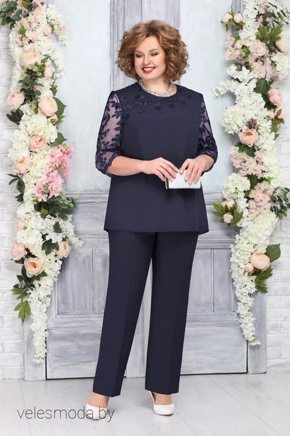 Нарядный костюм отлично скрадывает несовершенства фигуры, делая силуэт более стройным и грациозным. Легкая блуза красиво расширяется к низу, прикрывая самую широкую часть бедер. Строгость дизайна прекрасно разбавляют полупрозрачные гипюровые рукава, декорированные нежным узором, составленным из переплетающихся между собой веточек. Область круглой горловины также украшена мелкими цветами и листиками. Лаконично и элегантно смотрятся зауженные в нижней части брюки. Аккуратные стрелки создают правильную вертикаль, визуальной уменьшая объем бедер.