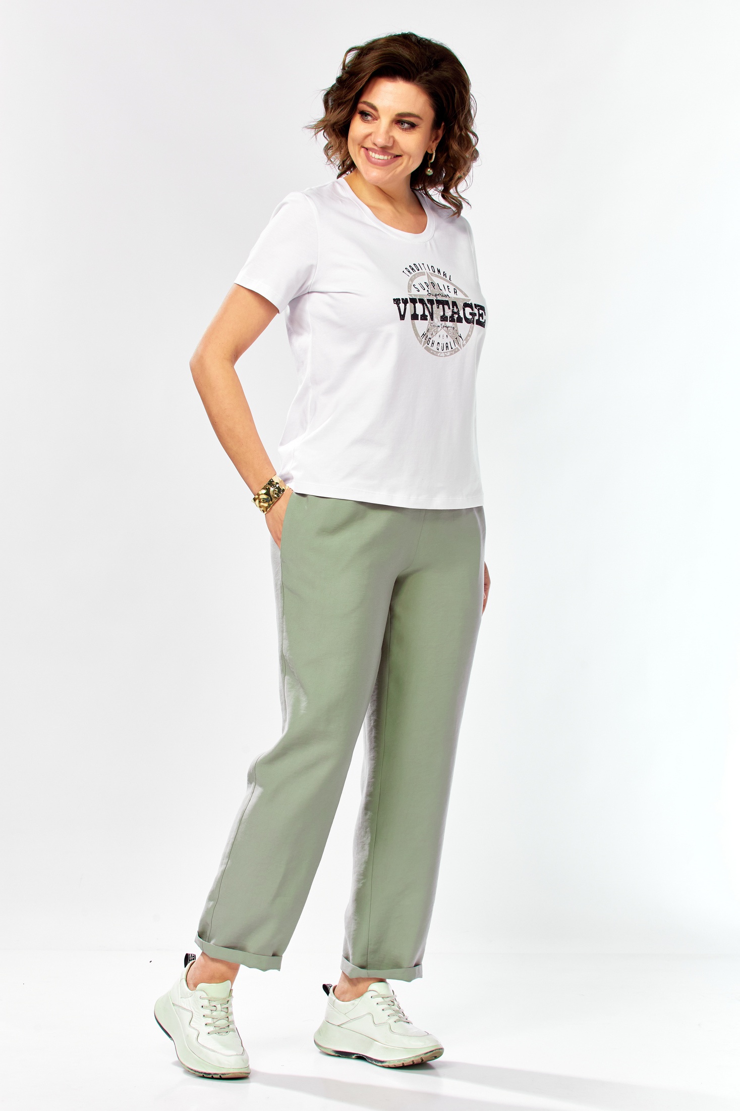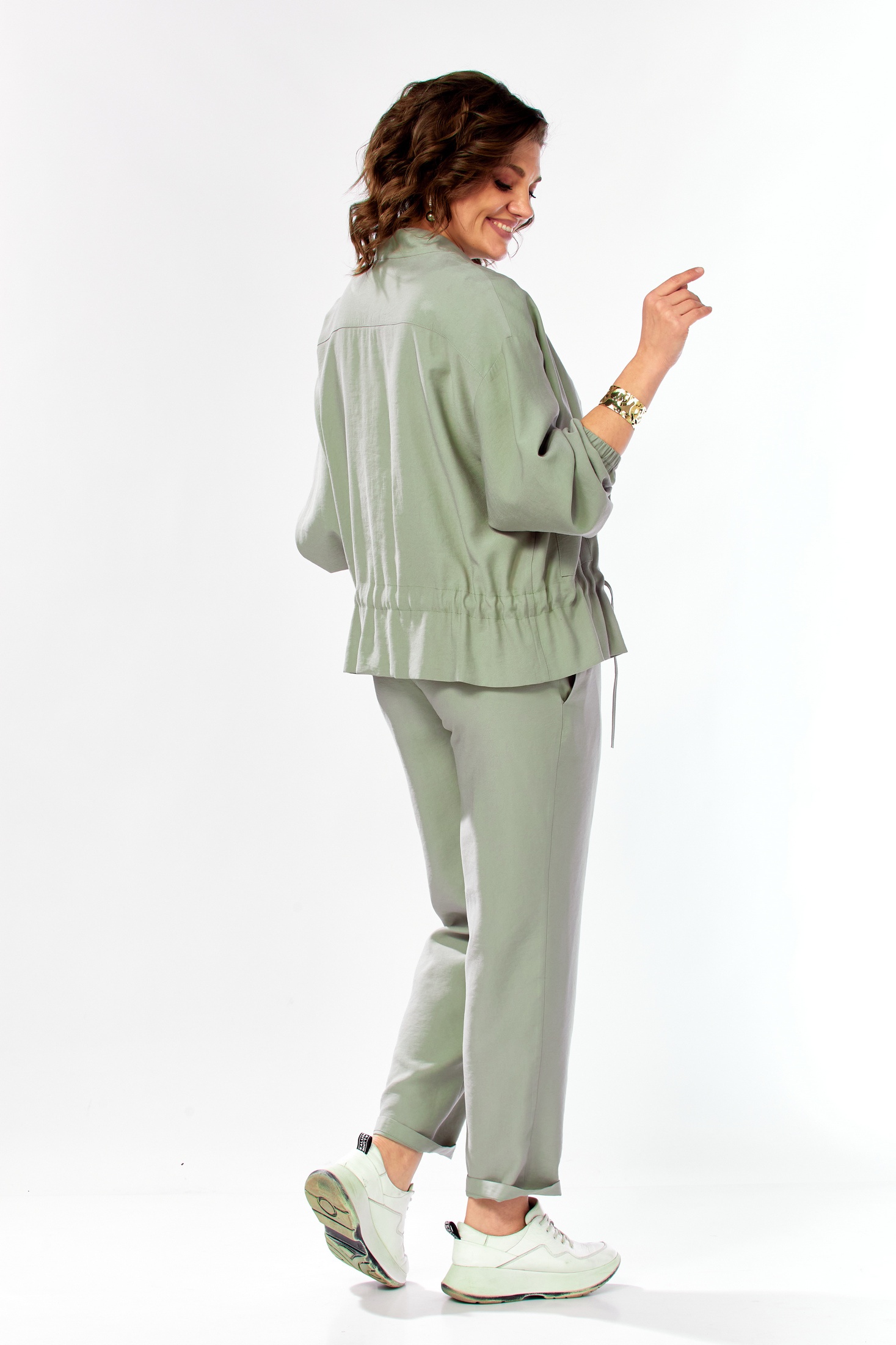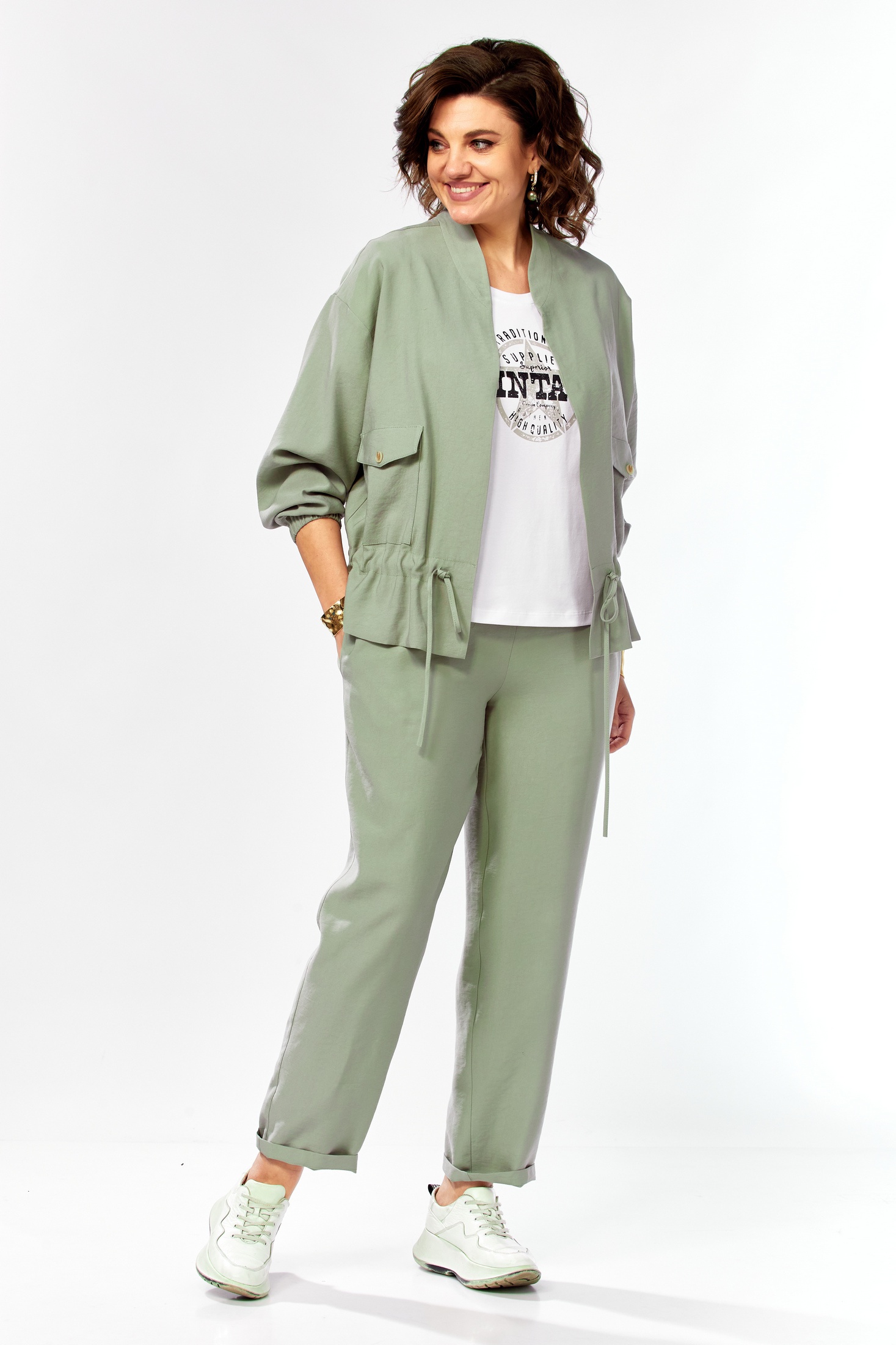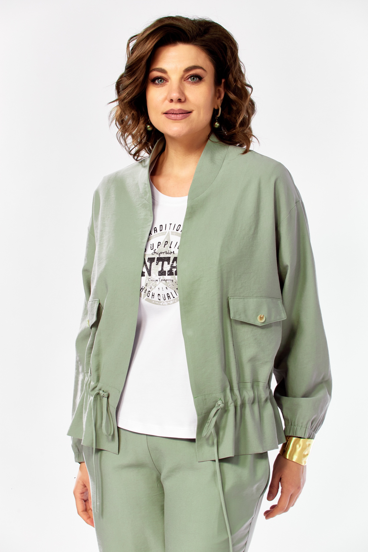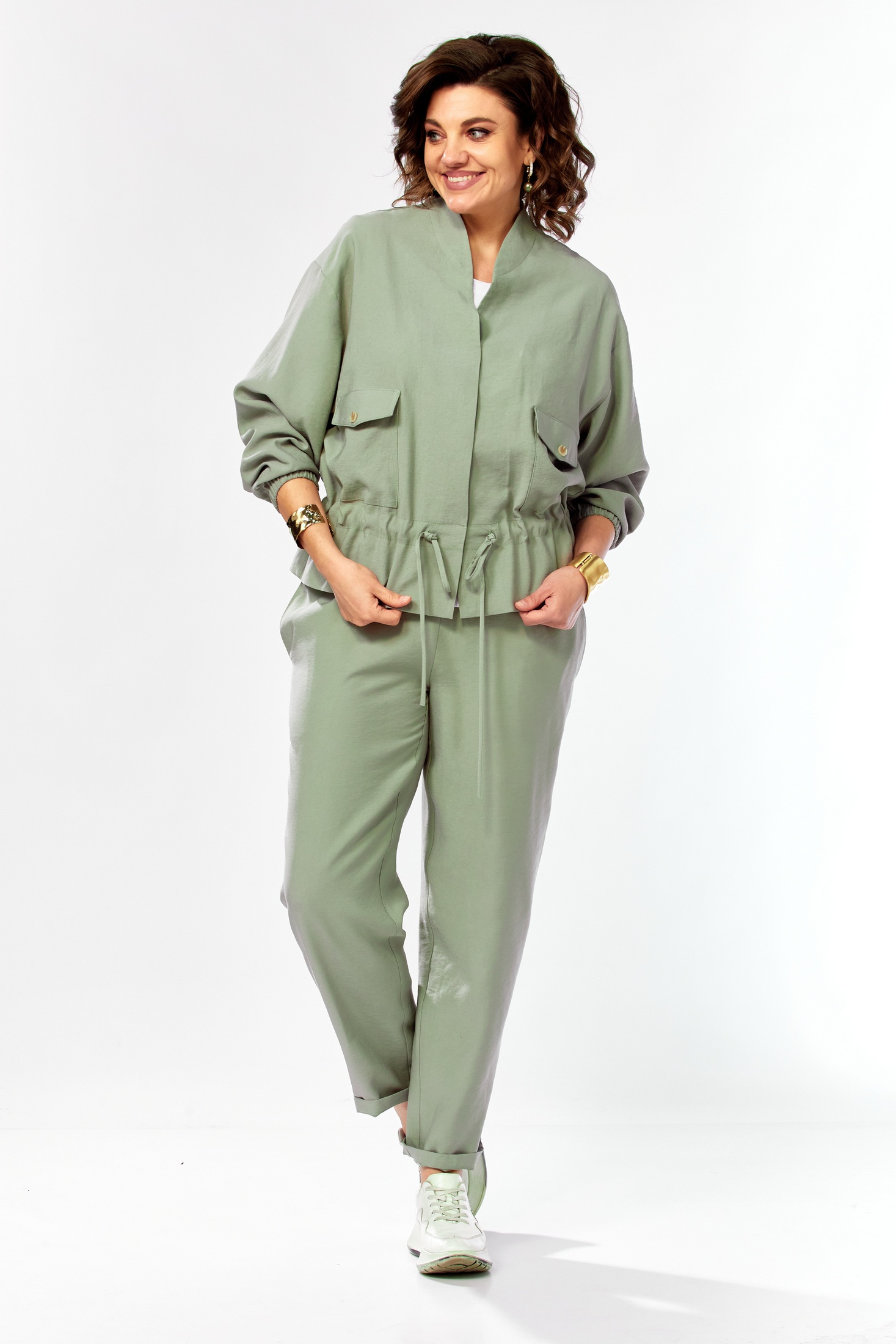 Костюм брючный 1011 серо-зеленый Ольга Стиль — идеальный выбор для вашего гардероба. Коллекция бренда Ольга Стиль предлагает комплект, состоящий из жакета длиной 60 см, зауженных брюк и блузки. Жакет с спущенным рукавом оснащен застежкой на магниты и воротником стойкой, украшен накладными карманами с клапанами и кулиской по талии. Брюки заужены к низу, а верхний срез на поясе частично на резинке, обеспечивая комфорт и изящный силуэт. Блузка с коротким рукавом и округлым вырезом добавляет легкости. Выполненный из сочетания полиэстера, вискозы и эластана, комплект подходит для весны и осени, облачая вас в стиль и удобство в деловом и повседневном стиле. Серо-зеленый оттенок добавляет свежести и оригинальности вашему образу.