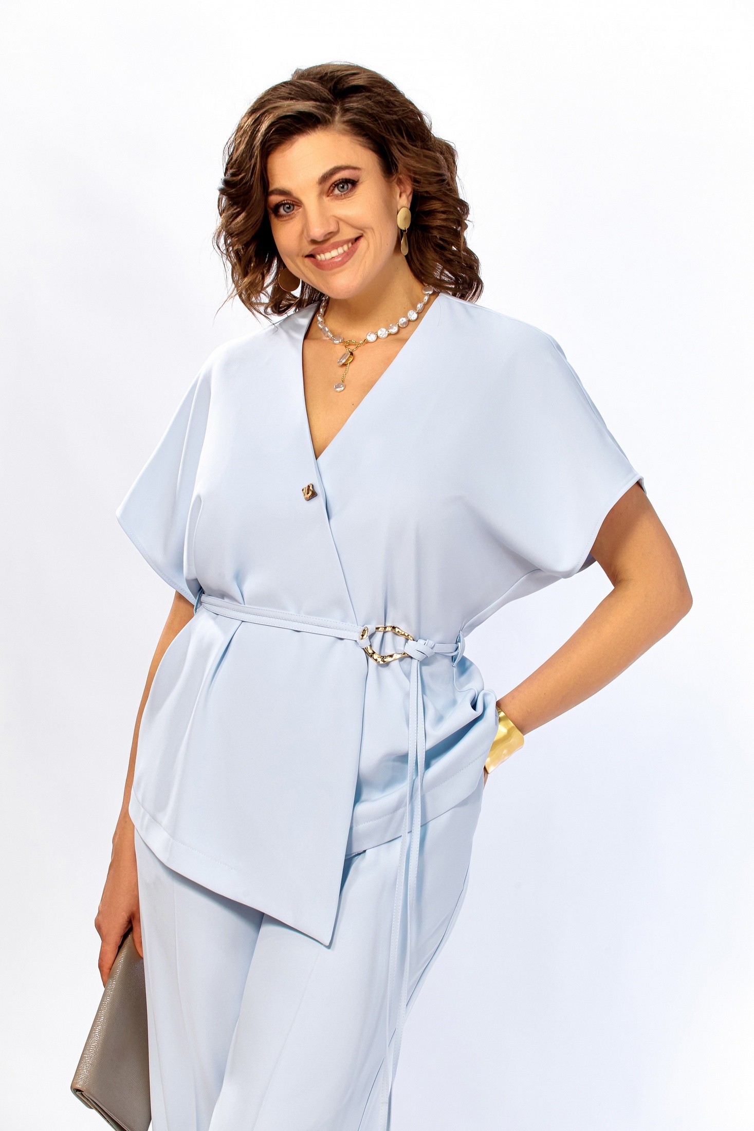 Костюм брючный 1020 голубой Ольга Стиль — это идеальное сочетание комфорта и стиля для вашего гардероба. Коллекция бренда Ольга Стиль представляет нарядный костюм прямого силуэта, выполненный из полиэстера, вискозы и спандекса. Блуза со спущенной линией плеча и застежкой на запах подчёркивает лёгкость и элегантность. Ассиметричный низ и декоративный пояс с пряжкой делают образ более выразительным. Брюки прямого кроя со стрелками и боковыми карманами идеально подходят для делового и нарядного стиля. Голубой цвет привносит свежесть и подходит для круглогодичной носки. Длина блузы — 66 см, длина брюк — 110 см, что позволяет создать гармоничный и законченный образ.