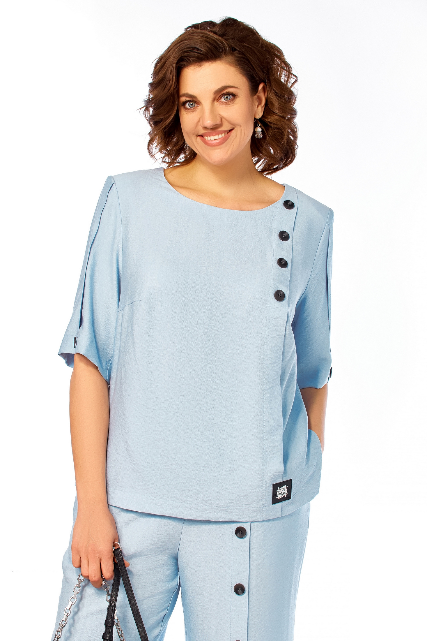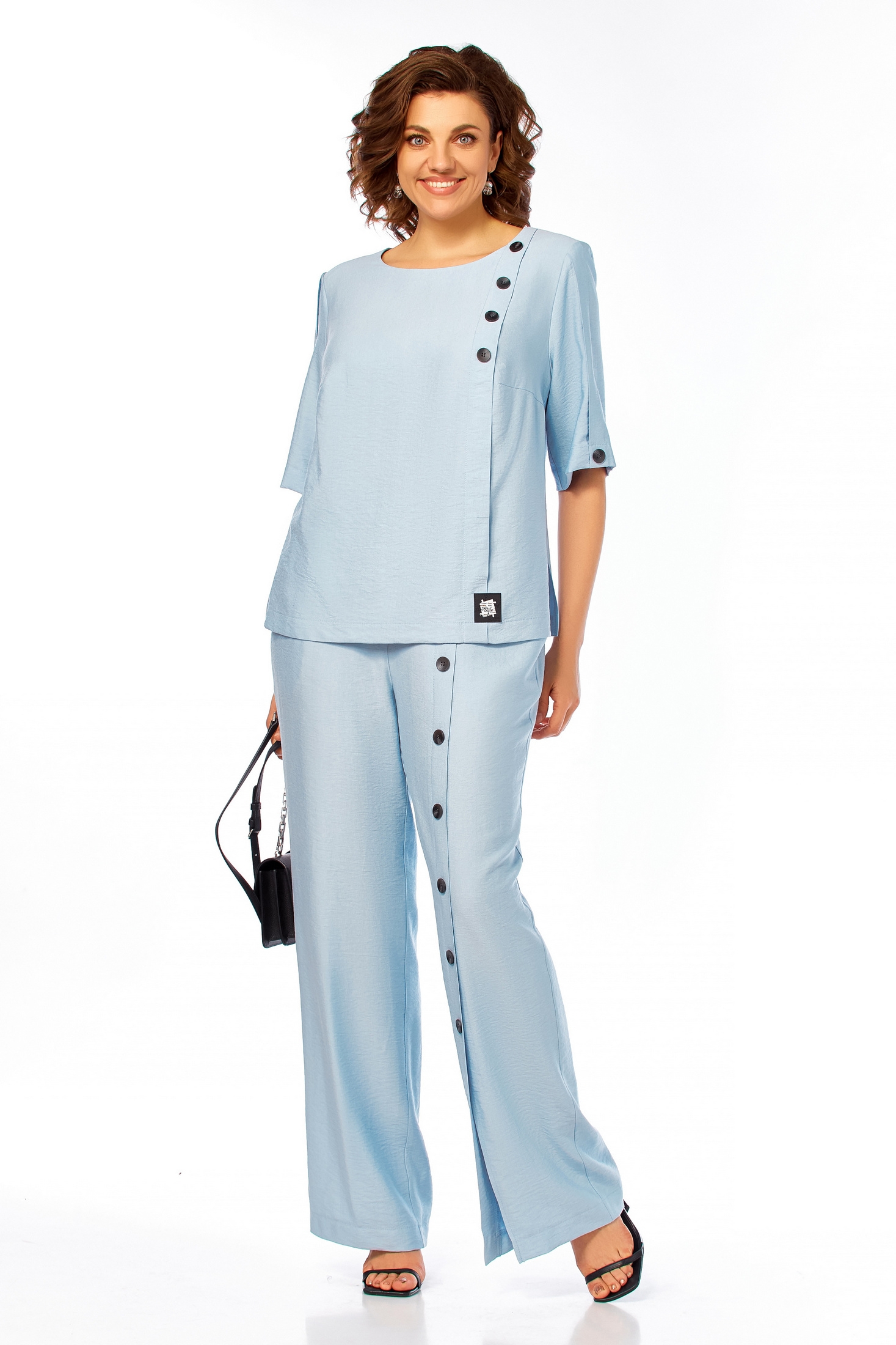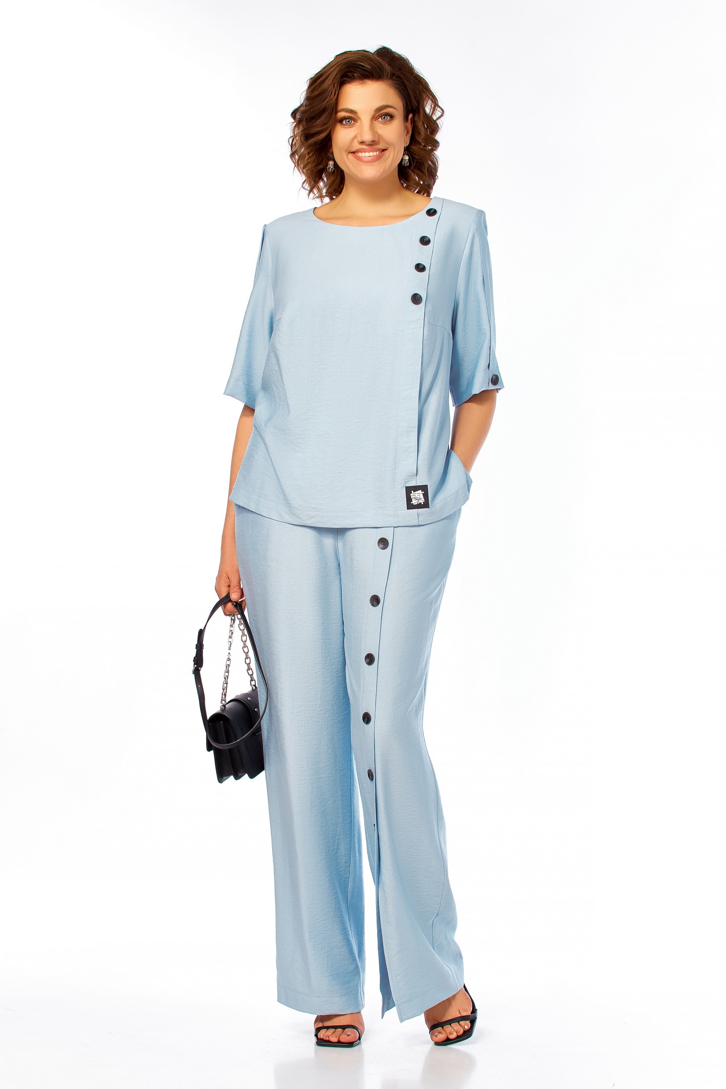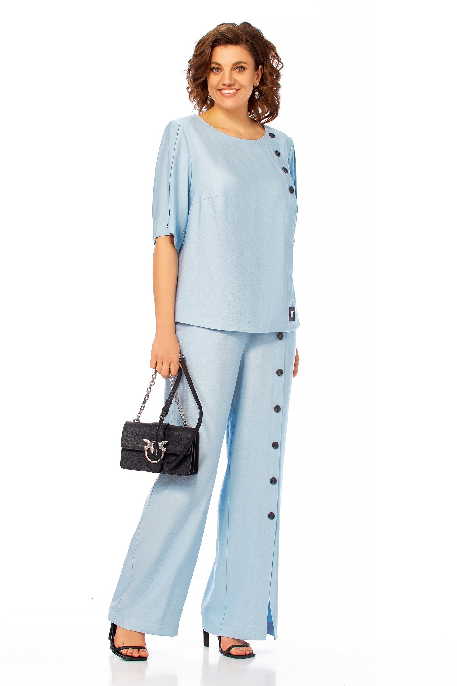 Костюм брючный 1022 голубой Ольга Стиль добавит лёгкости и элегантности вашему гардеробу. Коллекция бренда Ольга Стиль изготовлена из 55% льна и 45% вискозы, что обеспечивает комфорт и воздухопроницаемость в тёплое время года. Блуза полуприлегающего силуэта с округлым вырезом и декоративной складкой подчёркивает индивидуальность образа. Короткие рукава с пуговицами добавляют интересный акцент. Длина блузы составляет 58 см, длина рукава — 33,5 см, а длина брюк — 110 см. Прямые брюки с карманами и притачным поясом создают чистые линии, подходящие для повседневного и офисного стиля. Голубой цвет костюма добавляет свежести, а разрезы в боковых швах и декоративные пуговицы завершают образ.