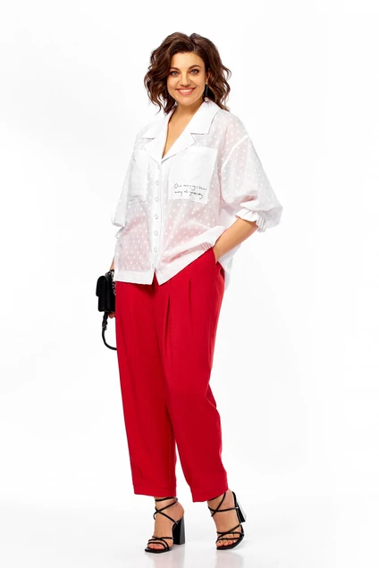 Костюм брючный 1024 белый + красный Ольга Стиль — это стильный комплект, состоящий из свободной блузки и брюк. Коллекция бренда Ольга Стиль предлагает уникальное сочетание натурального хлопка в блузке и сочетания полиэстера, вискозы и эластана в брюках. Блузка с рубашечным воротником и яркими настрочными карманами добавляет индивидуальности образу. Складка и манжеты на брюках, а также частично эластичный пояс, подчёркивают комфорт и практичность. Длина спинки составляет 74 см, длина брюк — 100 см. Этот наряд идеально подойдёт для повседневных и деловых встреч, предлагая стиль и удобство на любой сезон. Основные цвета — белый и красный — добавляют яркость и современность вашему гардеробу.