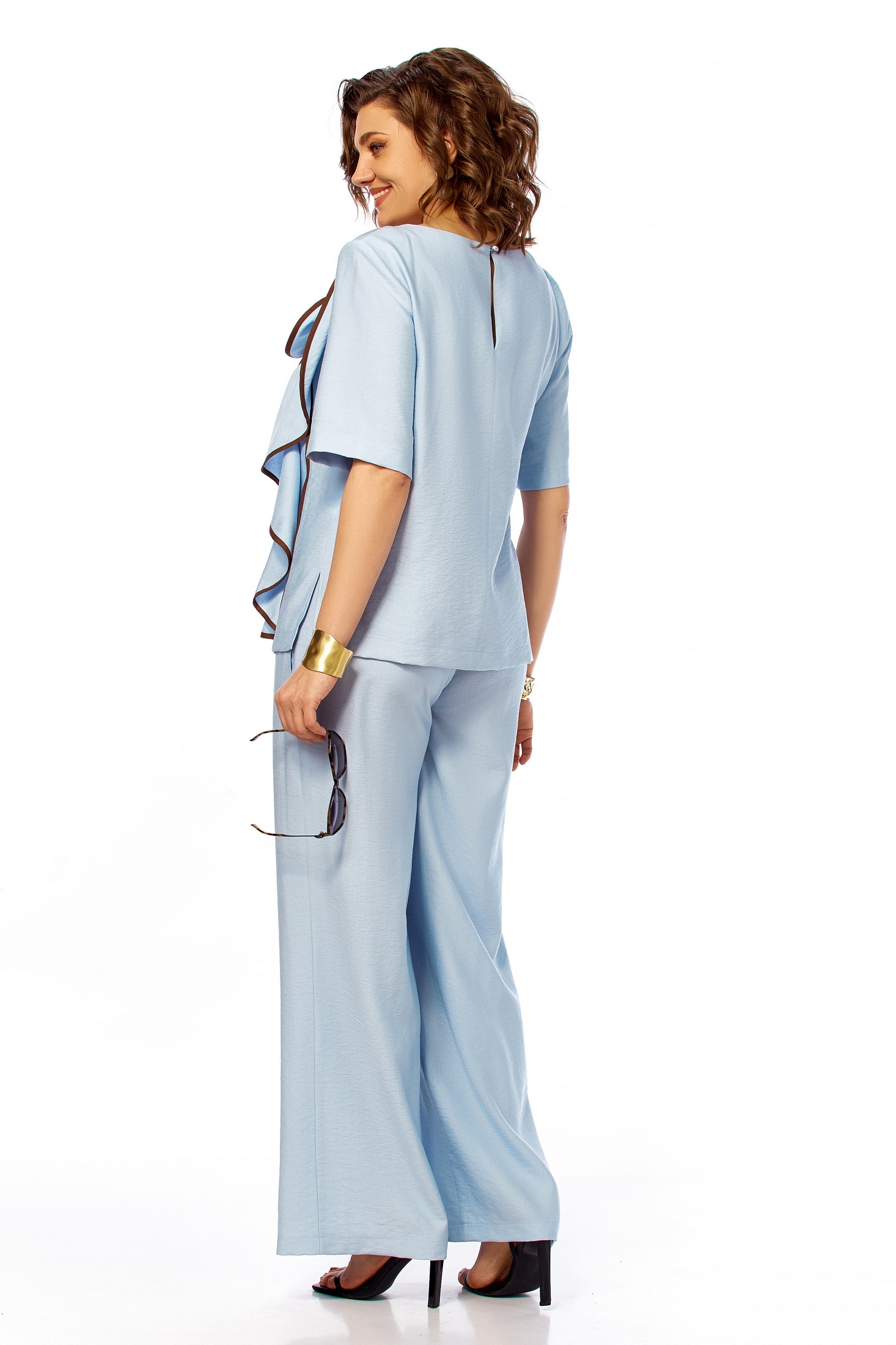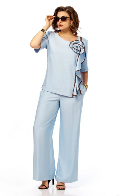 Костюм брючный 1028 голубой Ольга Стиль - это стильный нарядный комплект из коллекции бренда Ольга Стиль. Выполнен из приятного на ощупь сочетания льна и вискозы, он идеально подходит для весенне-летнего сезона. Брючный костюм включает прямую блузу с декоративным цветком и рукавом длиной 48 см, а также прямые брюки с карманами и поясом на резинке по спинке. Потайная молния на спинке блузы и длина изделия 60 см обеспечивают комфорт и элегантность. Блуза и брюки, выполненные в голубом цвете, подчеркивают индивидуальный стиль и современный силуэт, подходящий как для офисных событий, так и для вечерних прогулок.