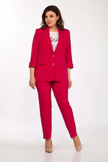 Стильный комплект состоящий из жакета, брюк и блузы. Жакет полуприлегающего силуэта, на подкладке с застежкой на 2 пуговицы. Рукав трехчетвертной с манжетами. По переду обработаны карманы с клапанами. Блуза с цельнокроенным коротким рукавом. Брюки чуть заужен к низу, на поясе и с застежкой на пуговицу и тесьму-молнию. Длина жакета по ср.шву 71 см, длина рукава 46см. Длина блузки 67 см. Длина брюк 100 см