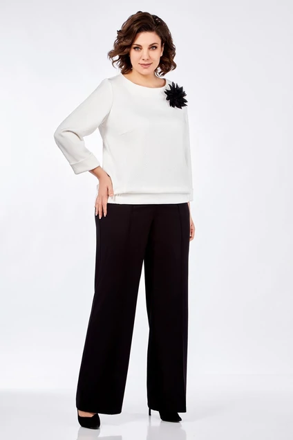 Нарядный женский комплект, выполнен на контрастном классическом сочетании белого верха и черного низа. Блузон с округлым вырезом горловины прямого силуэта, по переду рельефные швы и вытачки. Слева крепится сьемный декоративный цветок, украшенный сеточкой, низ присобран на широкую резинку по бокам. Рукав прямой длиной 7/8 с отложной манжетой. Брюки расширенные к низу с боковыми карманами, пояс по спинке на резинке. брюки ПЭ 54%, вискоза 44%, эластан 2%
