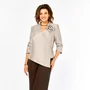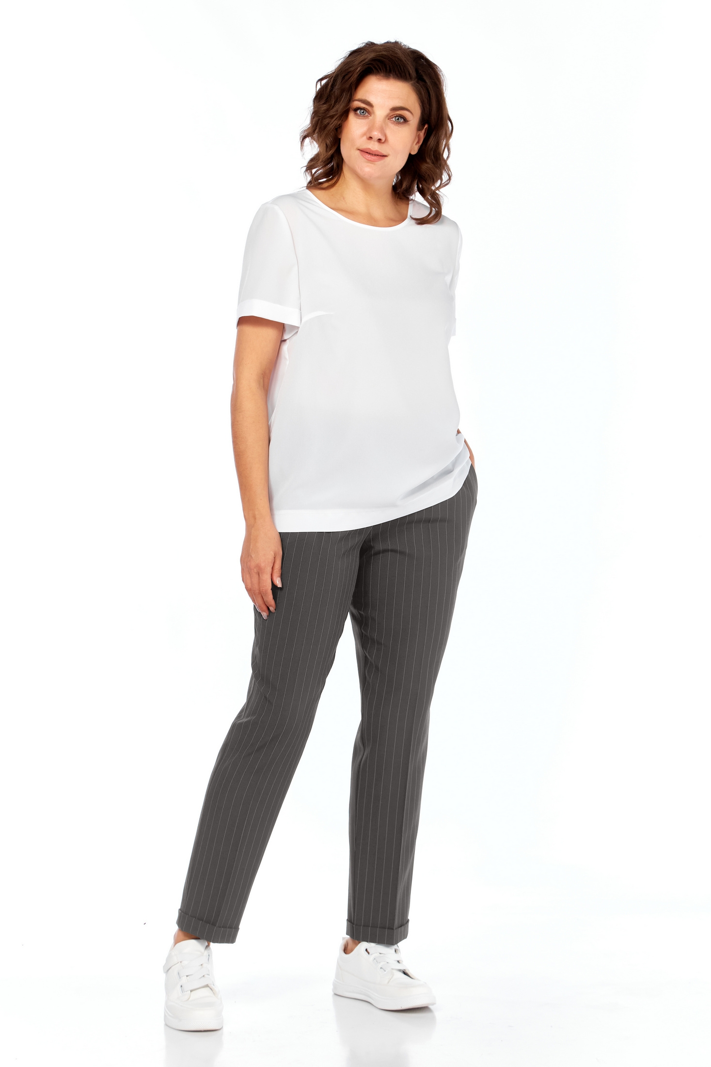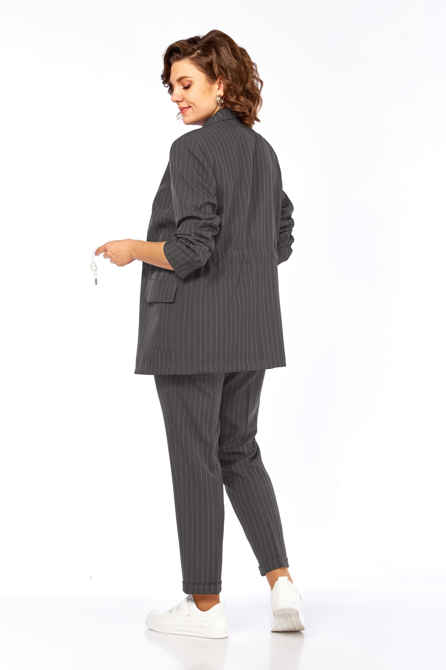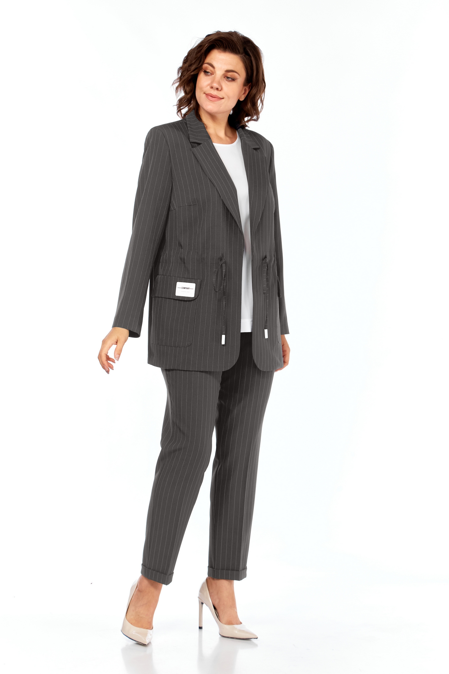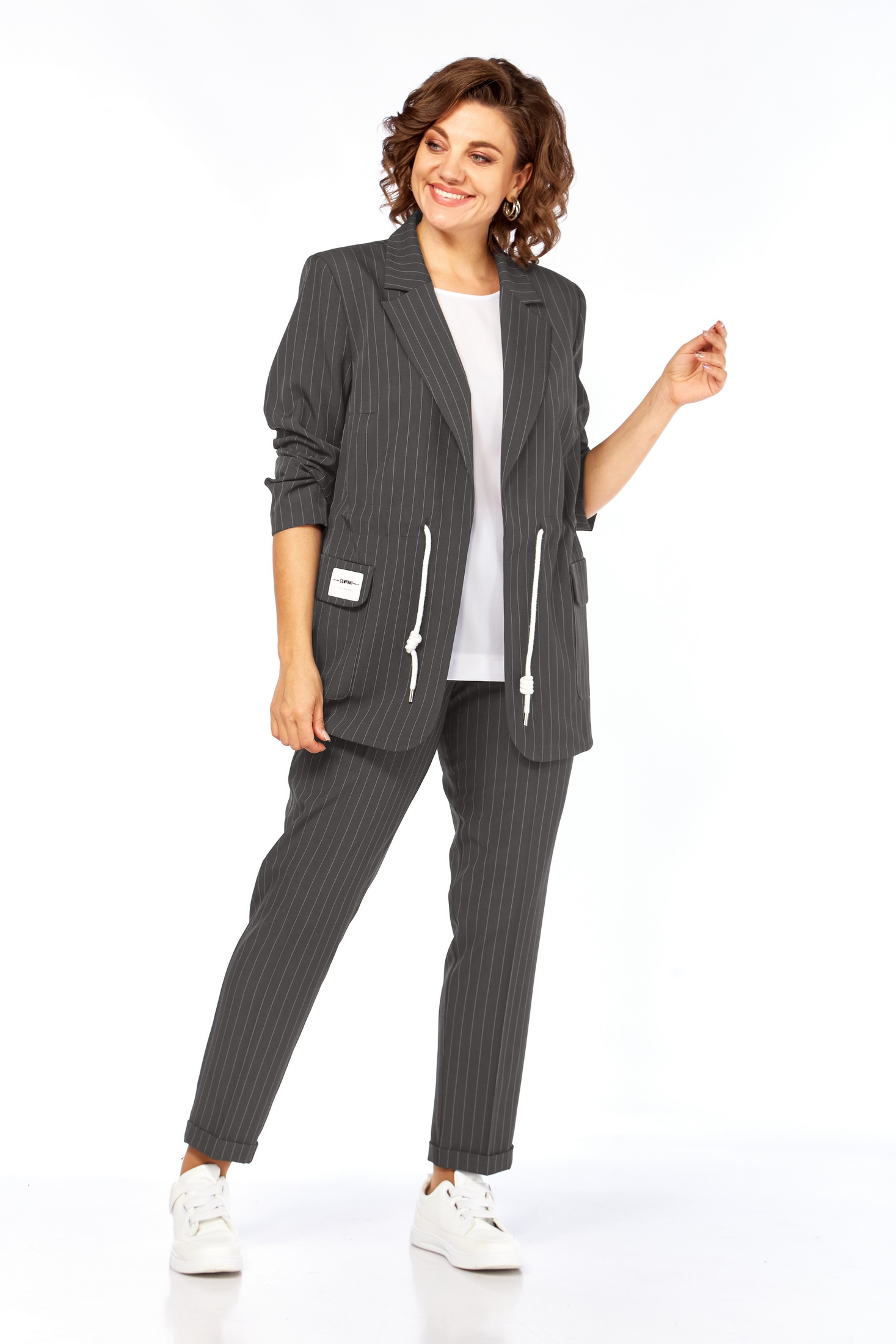 Стильный комплект состоящий из жакета, брюк и блузы. Жакет прямого силуэта с пиджачным воротником, подкладка на полочке, без застежки. По бокам накладные карманы с клапанами. На правом клапане декоративная нашивка. По талии кулиска. Рукава втачные, длиной три четверти с патами. Брюки прямые, зауженные к низу, с отворотом, пояс притачной на эластичной тесьме с кулиской, боковые карманы . Блуза прямого силуэта, рукав короткий. В комплекте два шнурка белый и в тон костюма. Длина блузы 73 см, длина жакета 74 см, длина рукава жакета 48 см, длина брюк 100 см