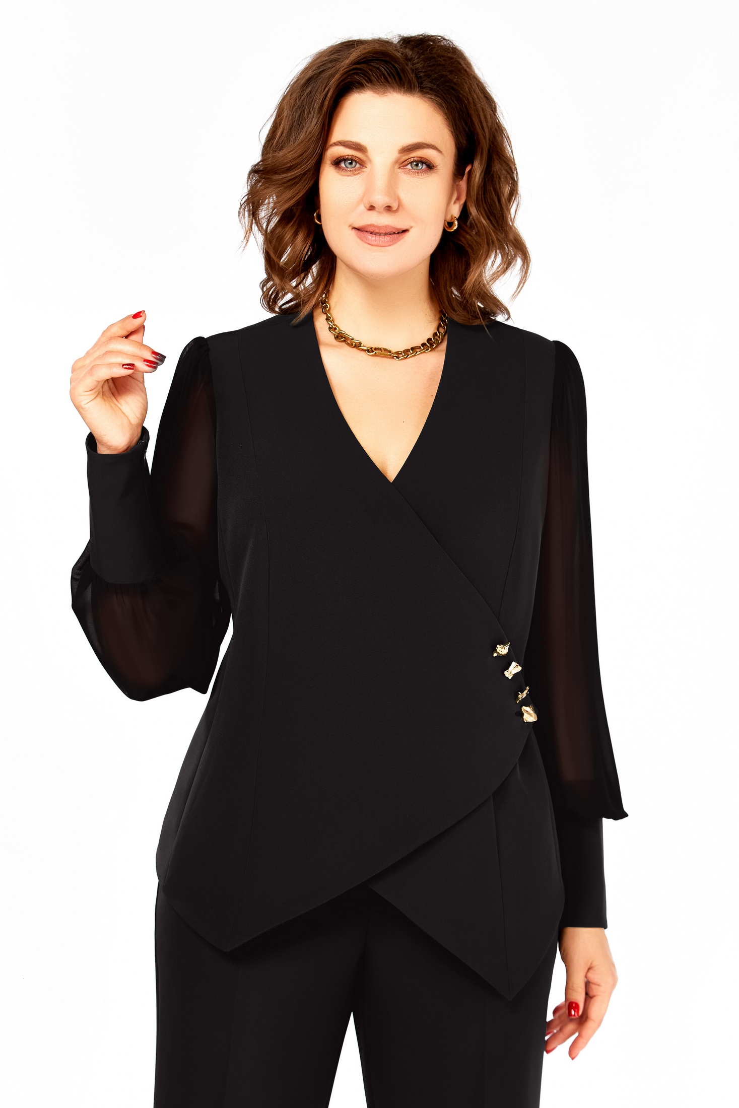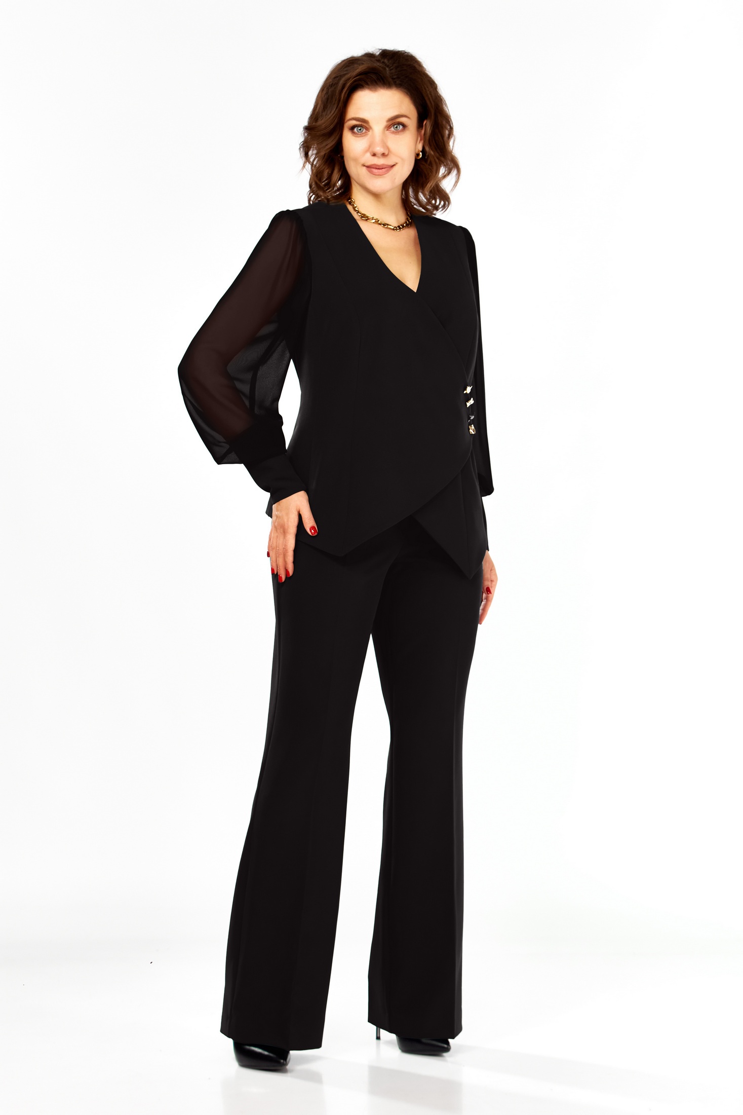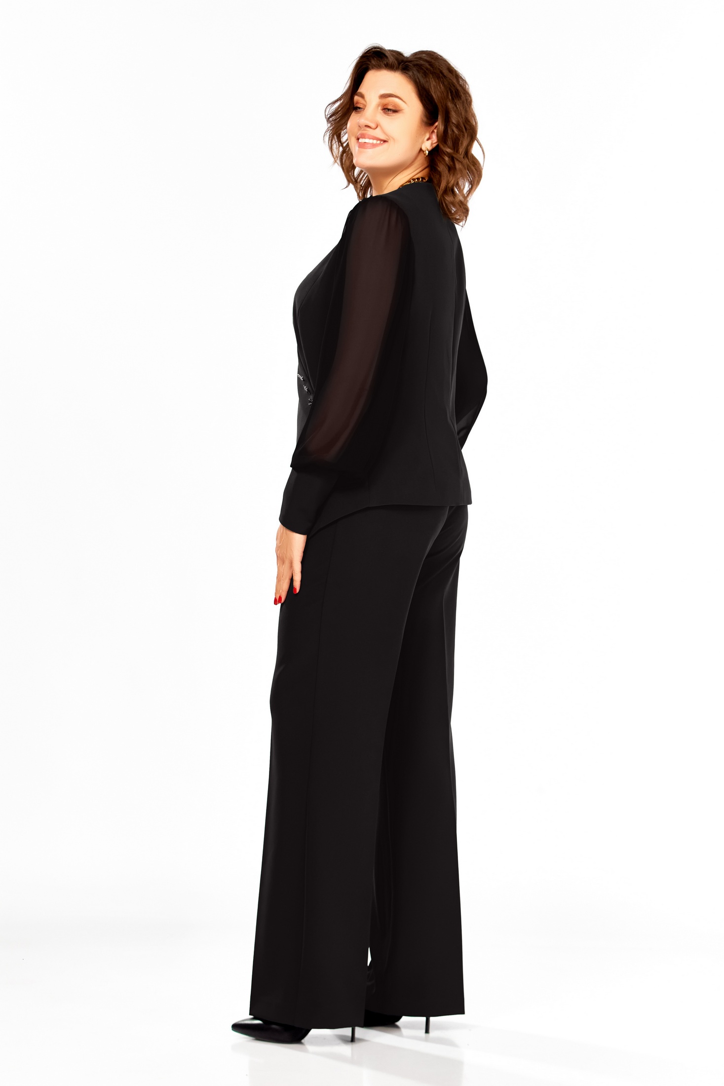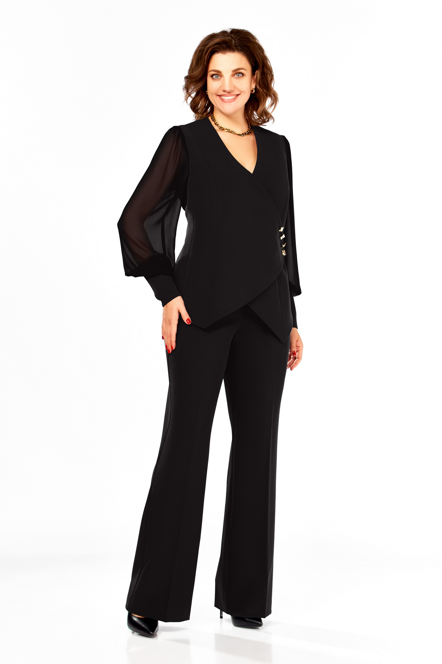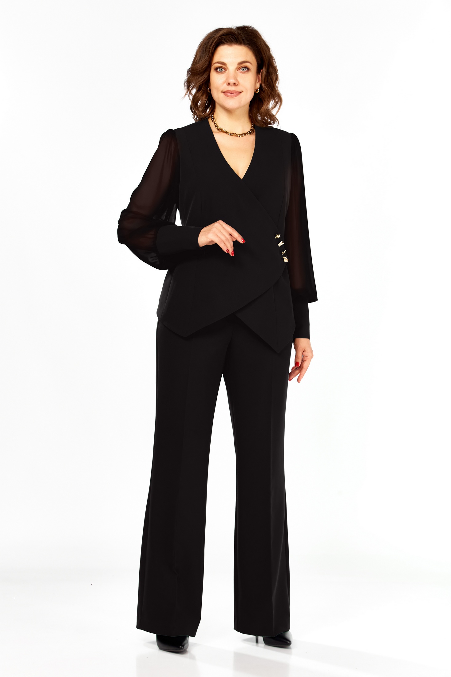 Нарядный костюм полуприлегающего силуэта. Жакет с V-образным вырезом горловины и фигурным низом, застежка на запах в облости талии, верхние пуговицы декоративные. По спинке рельефы и средний шов. Рукав втачной шифоновый на манжете из основной ткани, застегивающийся на потайную молнию. Брюки слегка расклешенные, на поясе. Пояс по спинке на резинке. Заутюжены стрелки.Длина жакета 60см, длина рукава 65см без учета напуска, длина брюк 114см