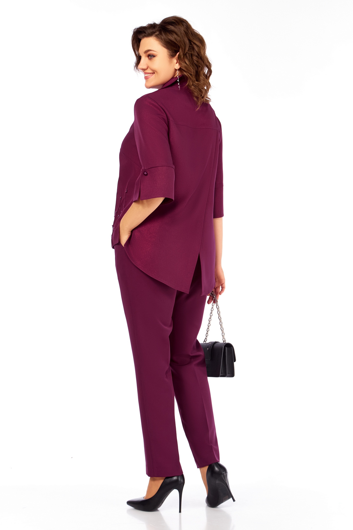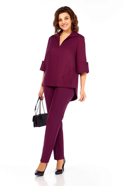 Костюм брючный 987 бургунди Ольга Стиль — стильный выбор для вашего гардероба. Коллекция бренда Ольга Стиль включает в себя блузу и брюки, выполненные из мягкого полиэстера с добавлением вискозы и эластана, что обеспечивает комфорт и легкость движений. Блуза с блеском украшена декоративными элементами из защипов и бусин, имеет V-образный вырез и фигурный низ. Брюки с слегка зауженными снизу стрелками и удобной резинкой по спинке подходят для повседневной носки. Этот костюм в насыщенном бордовом цвете идеально подойдет для осеннего сезона, создавая деловой и стильный образ.