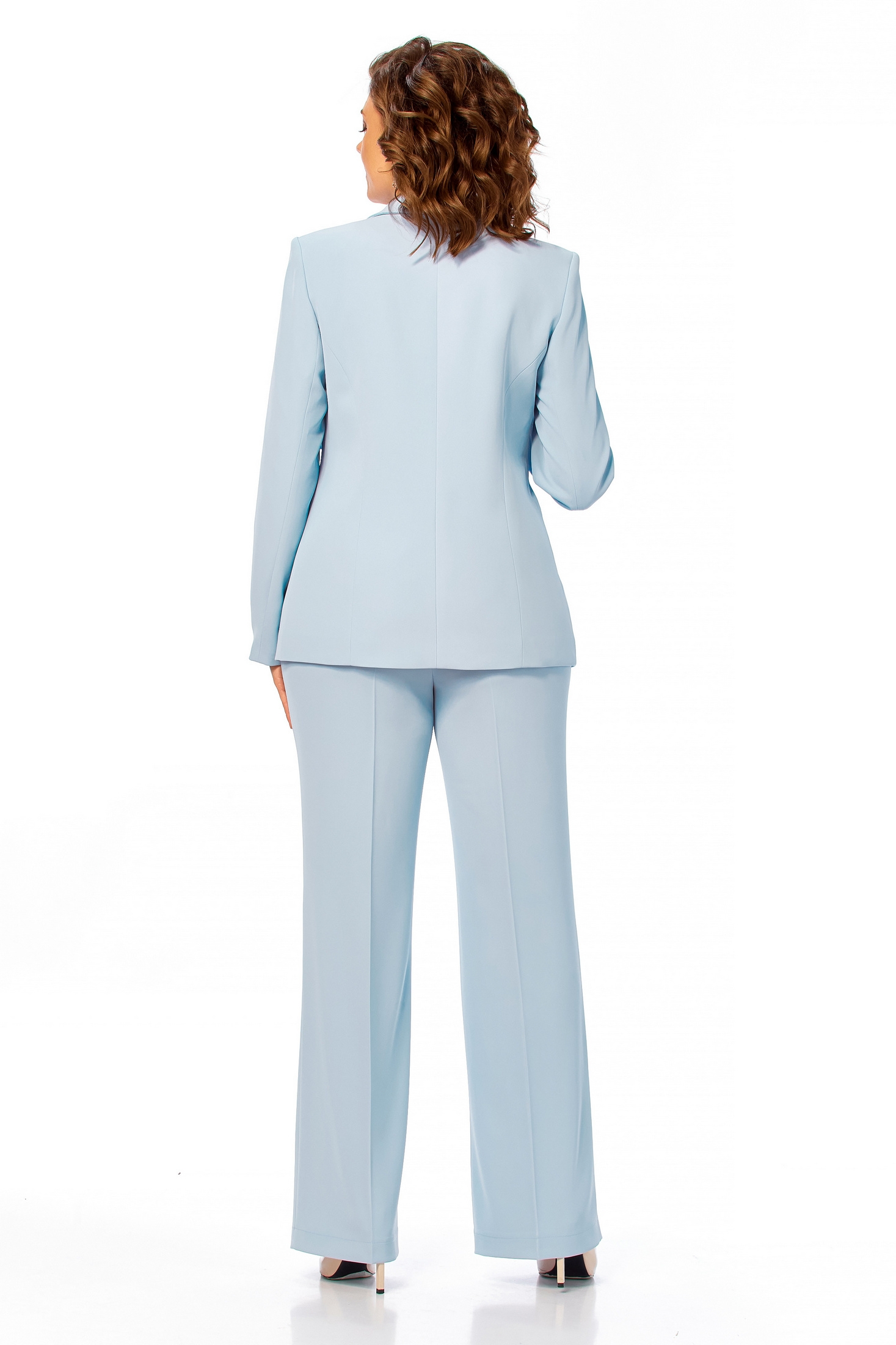 Костюм брючный 998 голубой Ольга Стиль. Коллекция бренда Ольга Стиль представляет стильный офисный костюм голубого цвета. Изготовлен из сочетания полиэстера, вискозы и эластана, материал одежды обеспечивает комфорт и лёгкость. Жакет на подкладке с пиджачным воротником и фигурным срезом борта. Декоративная шнуровка и прорезные карманы добавляют утончённости. Длинный двухшовный рукав и расклешённые брюки с резинкой на поясе и заутюженными кантами делают костюм идеальным для осеннего и весеннего периодов, а также для офисного или делового стиля. Длина жакета составляет 67 см, длина рукава — 61,5 см, брюки длиной 112 см. Гармония дизайна и практичности создаёт универсальный образ для уверенной женщины.