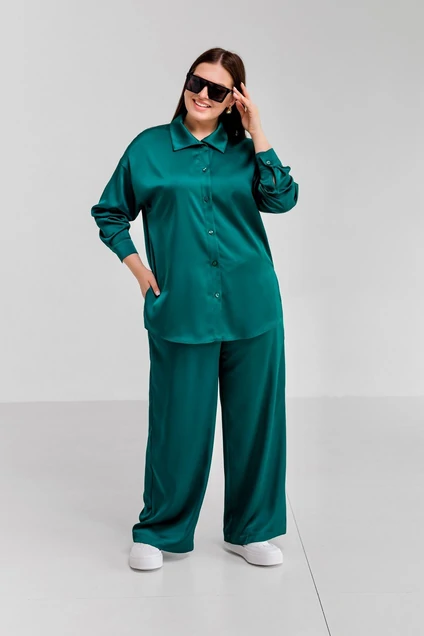 Костюм женский из блузы и брюк в «пижамном» стиле. Модель изготовлена из струящегося текстиля с мягким, благородным блеском.