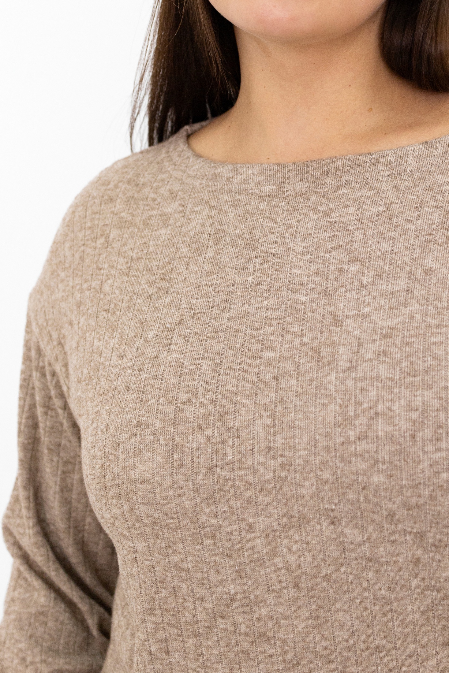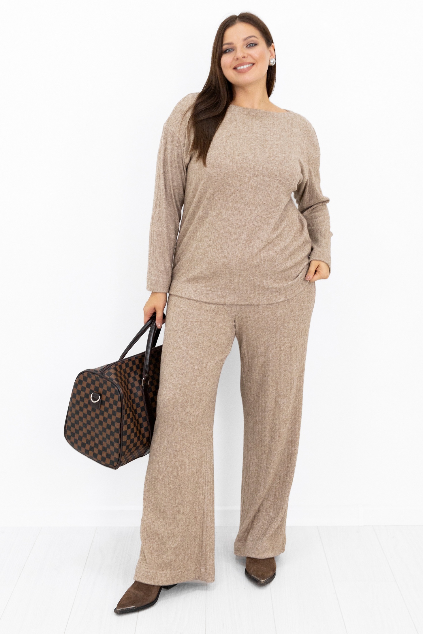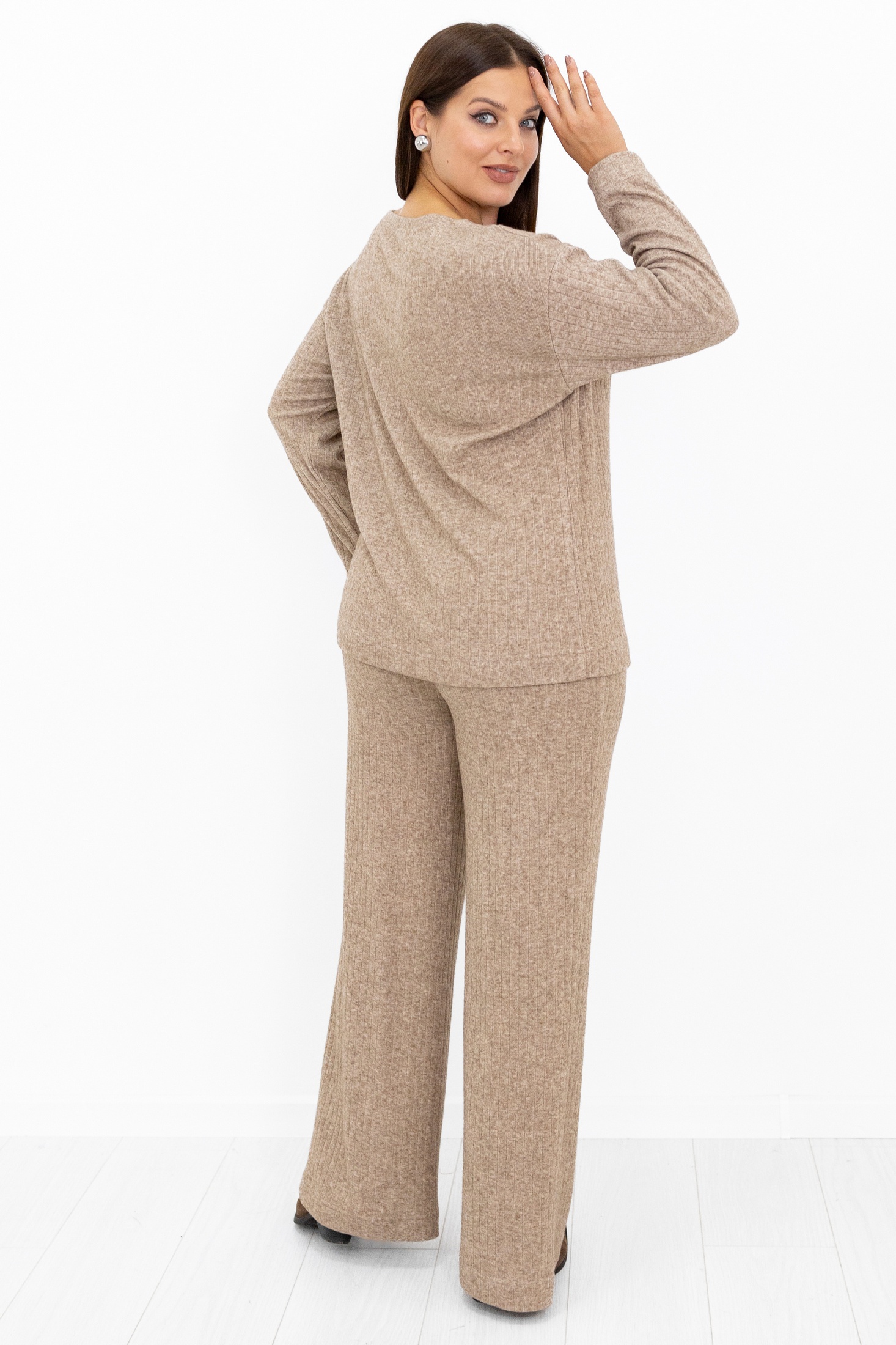 Костюм женский из джемпера и брюк. Модель выполнена из мягкого трикотажного полотна с лёгким меланжевым эффектом, в актуальных оттенках сезона – песочно-бежевый. Трикотаж фактурный, в бежевом оттенке – вязка «широкая лапша», в сером оттенке – вязка «соты»