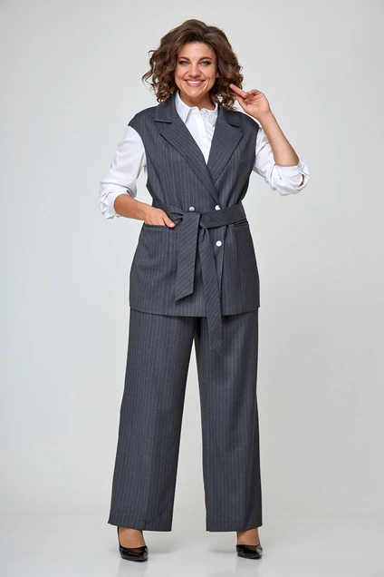 Костюм женский из жилета с поясом и брюк. Модель выполнена из костюмно-плательной ткани, поливискоза в полоску. Жилет прямого силуэта, на подкладке. Застежка двубортная на петли и пуговицы. Пуговицы металлические, на ножке. Воротник пиджачный. Карманы по переду прорезные, в рамку. Вертикальный рельеф по переду. Спинка со средним швом. В комплекте с жилетом, предусмотрен пояс из основной ткани, что даёт возможность создавать различные образы по желанию и настроению покупателя. Брюки прямые, умеренно широкие. Застежка функциональная, гульфик с молнией и петля с пуговицей по поясу. Пояс притачной, частично на резинке. В модели брюк предусмотрены шлёвки под ремень. Костюм прекрасно подойдет для работы в офисе и учёбы. Благодаря современному крою и актуальной фурнитуре, модель может быть использована не только как классическая база с белой рубашкой, но и как городской кэжуал, в сочетании с футболкой и белыми кедами. А универсальный графитовый цвет, прекрасно впишется в любой гардероб.