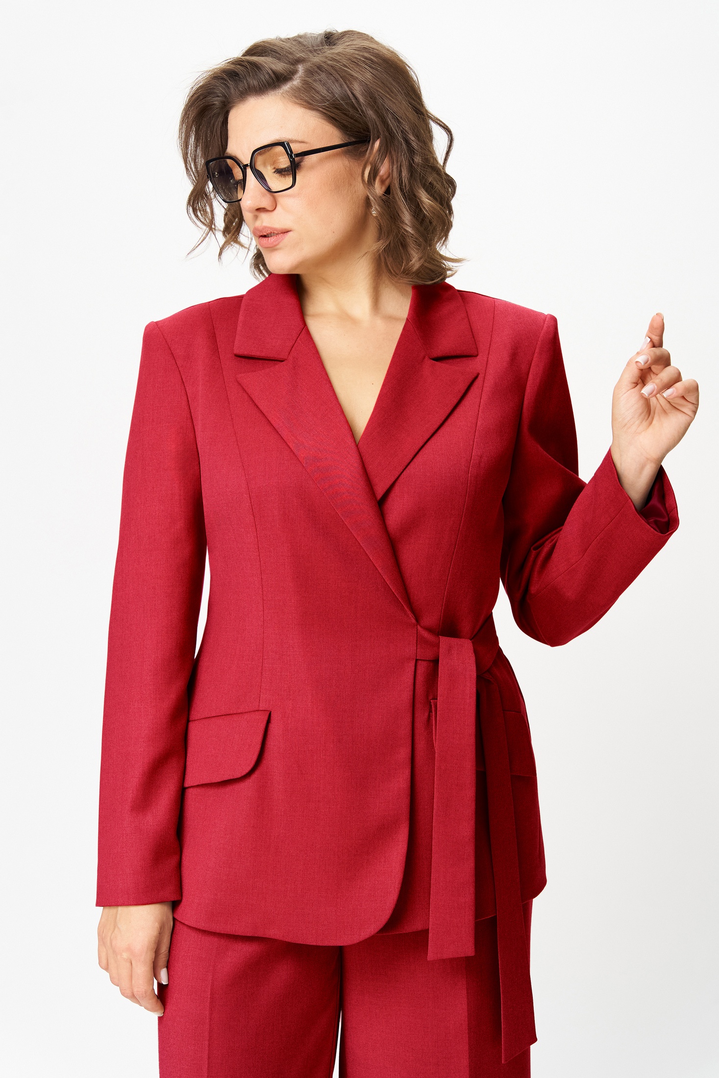 Жакет полуприлегающего силуэта с двубортной застежкой, завязывающейся на пояс. Воротник пиджачного типа. Рукав длинный, двушовный, втачной, плечо слегка расширено. Спинка со средним швом и рельефом из плечевого шва. По переду полурельеф из плеча, заканчивающийся вытачкой, обработаны прорезные карманы с листочкой и клапаном. Низ борта закругленный.
