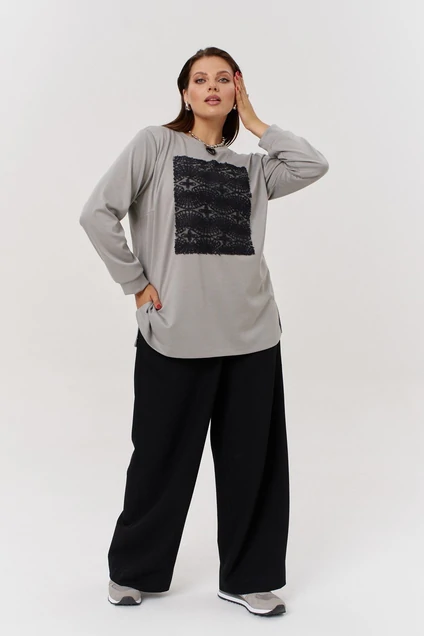 Невероятно комфортный комплект состоит из трикотажного джемпера и брюк. Джемпер свободного покроя с круглой горловиной. Рукав втачной, полномерный по обхвату, на манжете. По переду авторская вязаная аппликация шерстяным кружевом. Для удобства в боковых швах разрезы. Брюки в свободного силуэта в стиле палаццо, прямого кроя, с высокой посадкой. В боковых швах наклонные карманы. Притачной пояс на резинке. Оригинальный брючный комплект oversize благодаря качественным лекалам хорошо садится по фигуре, не мнётся, удобен для повседневной носки и прекрасно выглядит! Ткань хорошо тянется и это позволяет вам комфортно себя чувствовать. Комплект подойдет для прогулки, встречи с друзьями. Вы с удовольствием оцените крой и удобство комплекта.