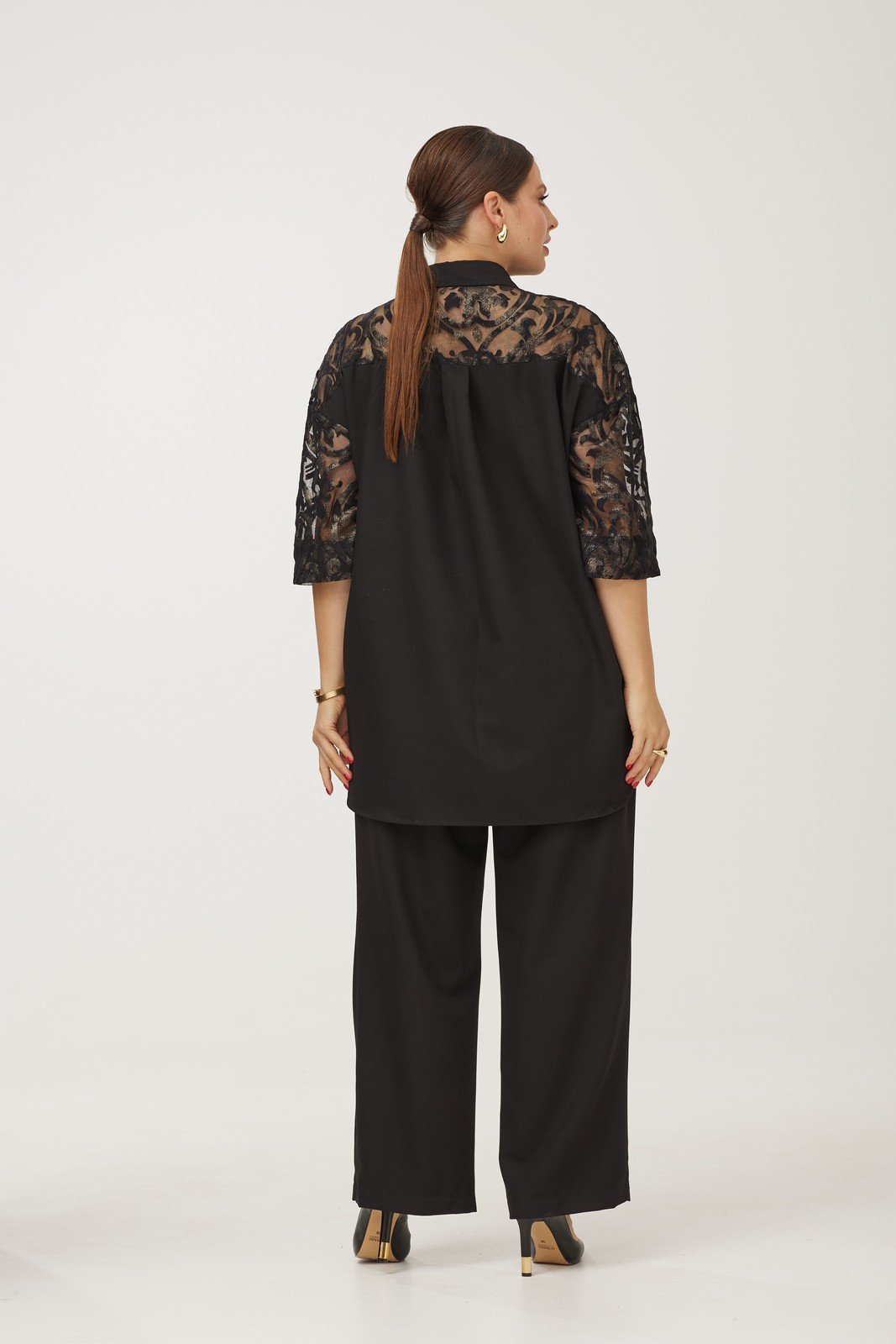 Стильный нарядный брючный костюм состоит из блузки и брюк. Блузка женская типа "рубашка", свободного силуэта, длиной ниже линии бедра, со вставкой из кружева на сетке с флоком (с блестящим напылением), по переду центральная застежка на петли-пуговицы. По спинке отрезная кокетка, от кокетки по центру заложена складка. Горловина оформлена рубашечным воротником со стойкой. Рукав кружевной, втачной, длина 3/4. Брюки женские классические, свободного силуэта, прямого кроя с высокой посадкой, с наклонными карманами в боковых швах, верхний срез оформлен поясом с эластичной резинкой. Внимание! Цветопередача фотографий может отличаться от реальности. Комплект представлен в двух вариантах: черный золотом(177) и черный с серебром (М177/1) Внимание! Цветопередача фотографий на Вашем устройстве может отличаться от реальности.